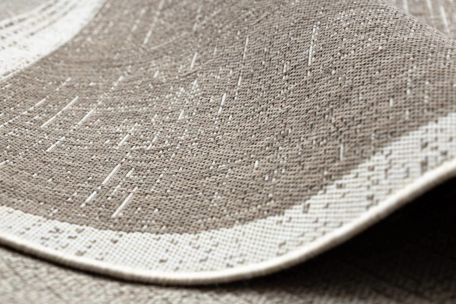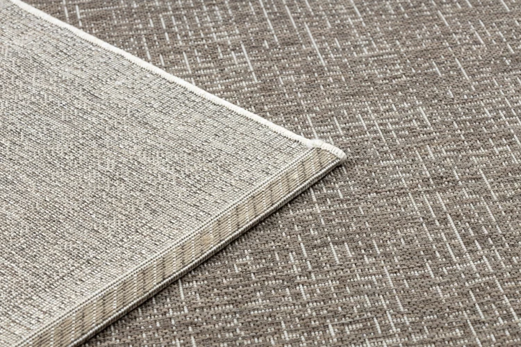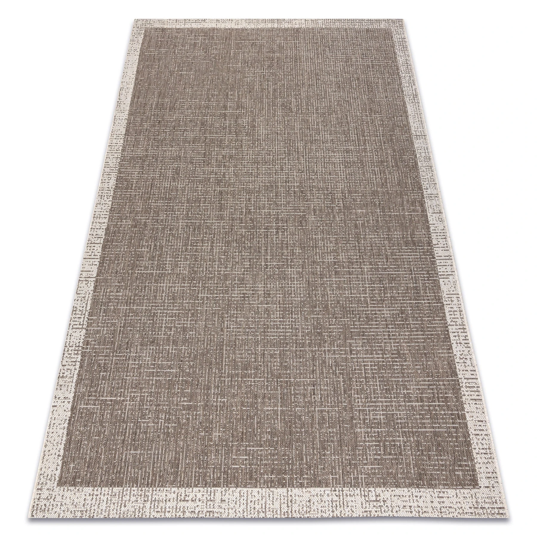 Sznurkowy dywan w odcieniu taupe z ramką, odporny na warunki atmosferyczne, idealny na taras i balkon.