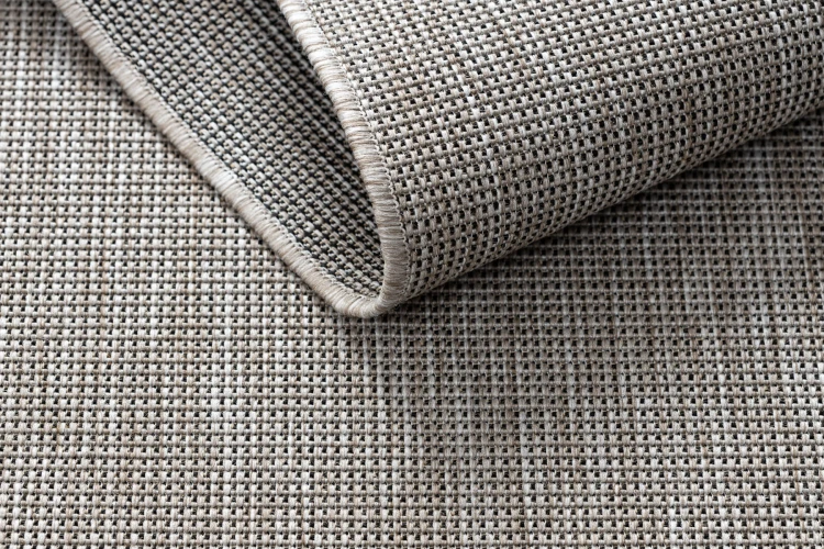 Sznurkowy dywan w odcieniu srebra z kontrastującą czernią, odporny na warunki atmosferyczne, idealny na taras i balkon.