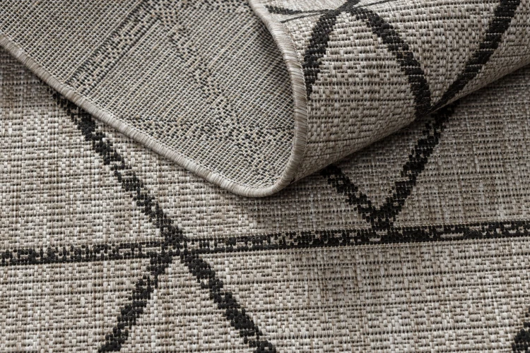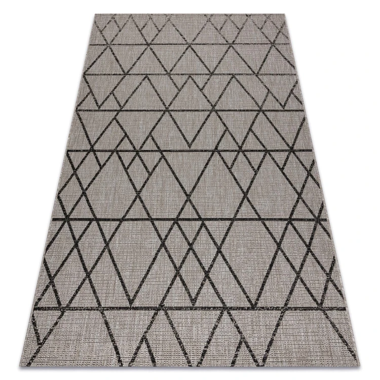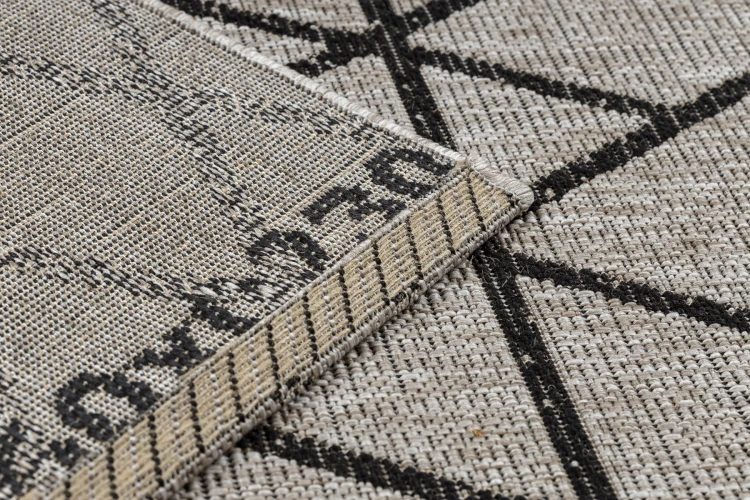 Sznurkowy dywan w odcieniach srebra i czerni, odporny na warunki atmosferyczne, idealny na taras i balkon.