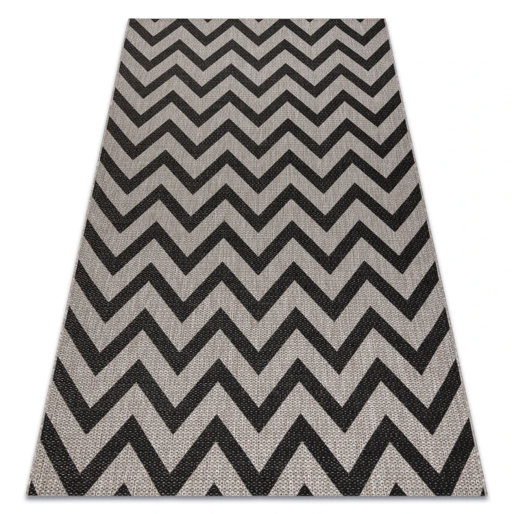 Sznurkowy dywan w odcieniach srebrnego i czarnego, odporny na warunki atmosferyczne, idealny na taras i balkon.