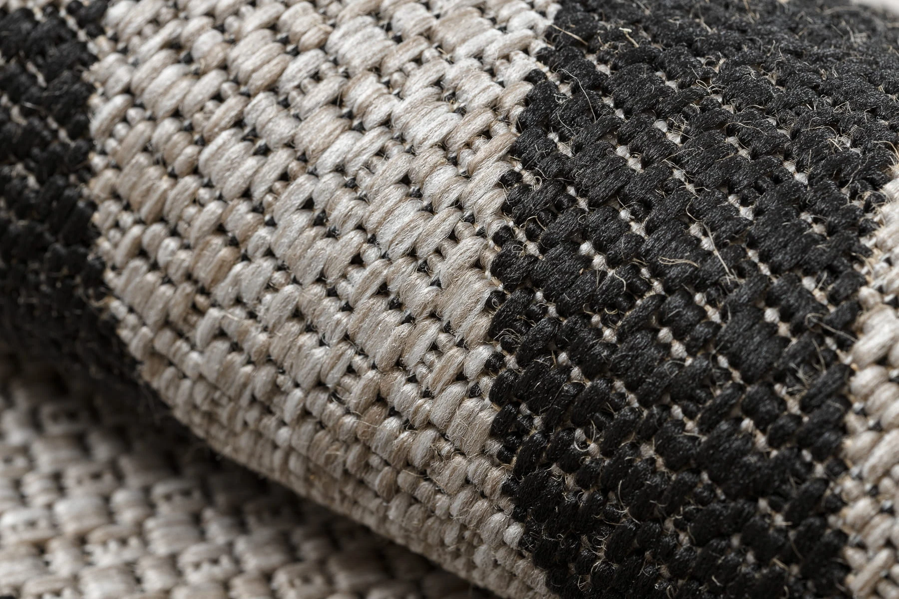 Sznurkowy dywan w odcieniach srebrnego i czarnego, odporny na warunki atmosferyczne, idealny na taras i balkon.