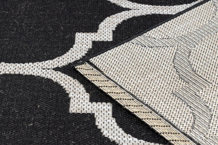 Sznurkowy dywan w czerni i srebrze z motywem marokańskiej koniczyny, odporny na warunki atmosferyczne, idealny na taras i balkon.