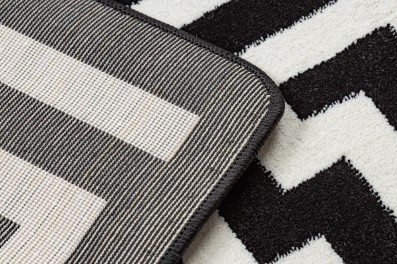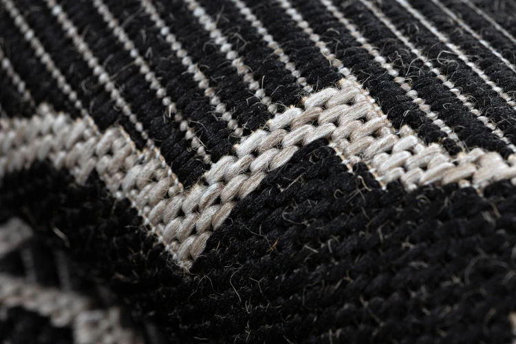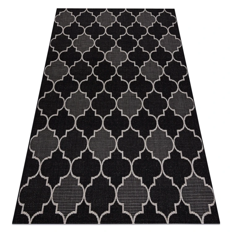 Sznurkowy dywan w czerni i srebrze z marokańską koniczyną, odporny na warunki atmosferyczne, idealny na taras i balkon.