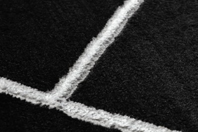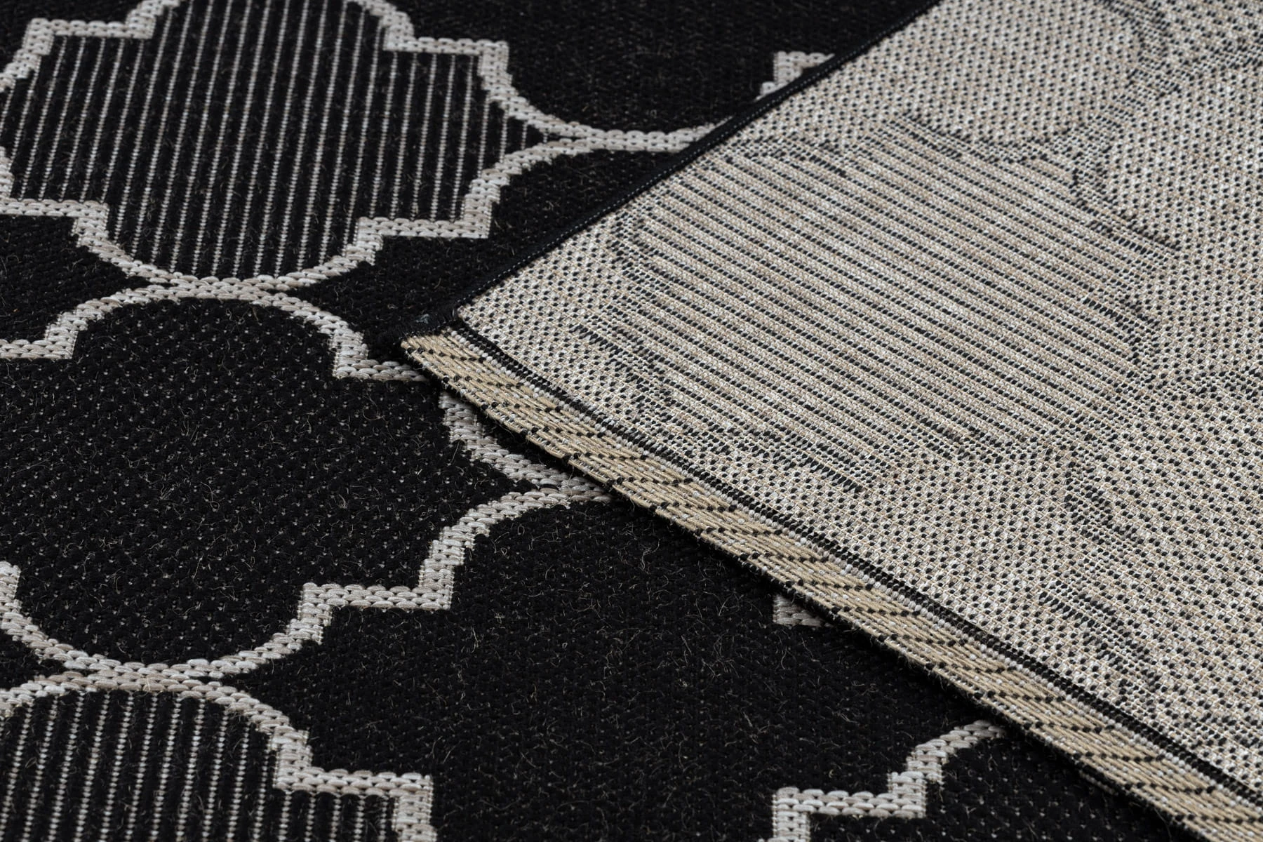 Sznurkowy dywan z geometrycznym wzorem marokańskiej koniczyny w czerni i srebrze, odporny na warunki atmosferyczne, idealny na taras i balkon.