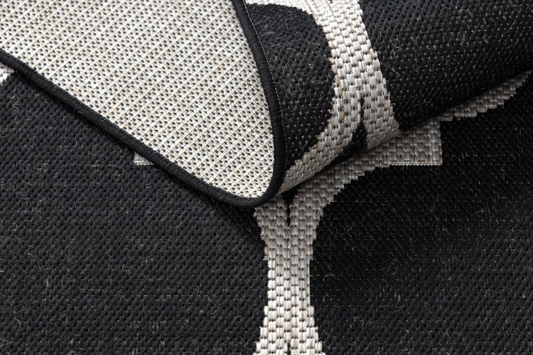 Sznurkowy dywan w czerni i srebrze z motywem marokańskiej koniczyny, odporny na warunki atmosferyczne, idealny na taras i balkon.