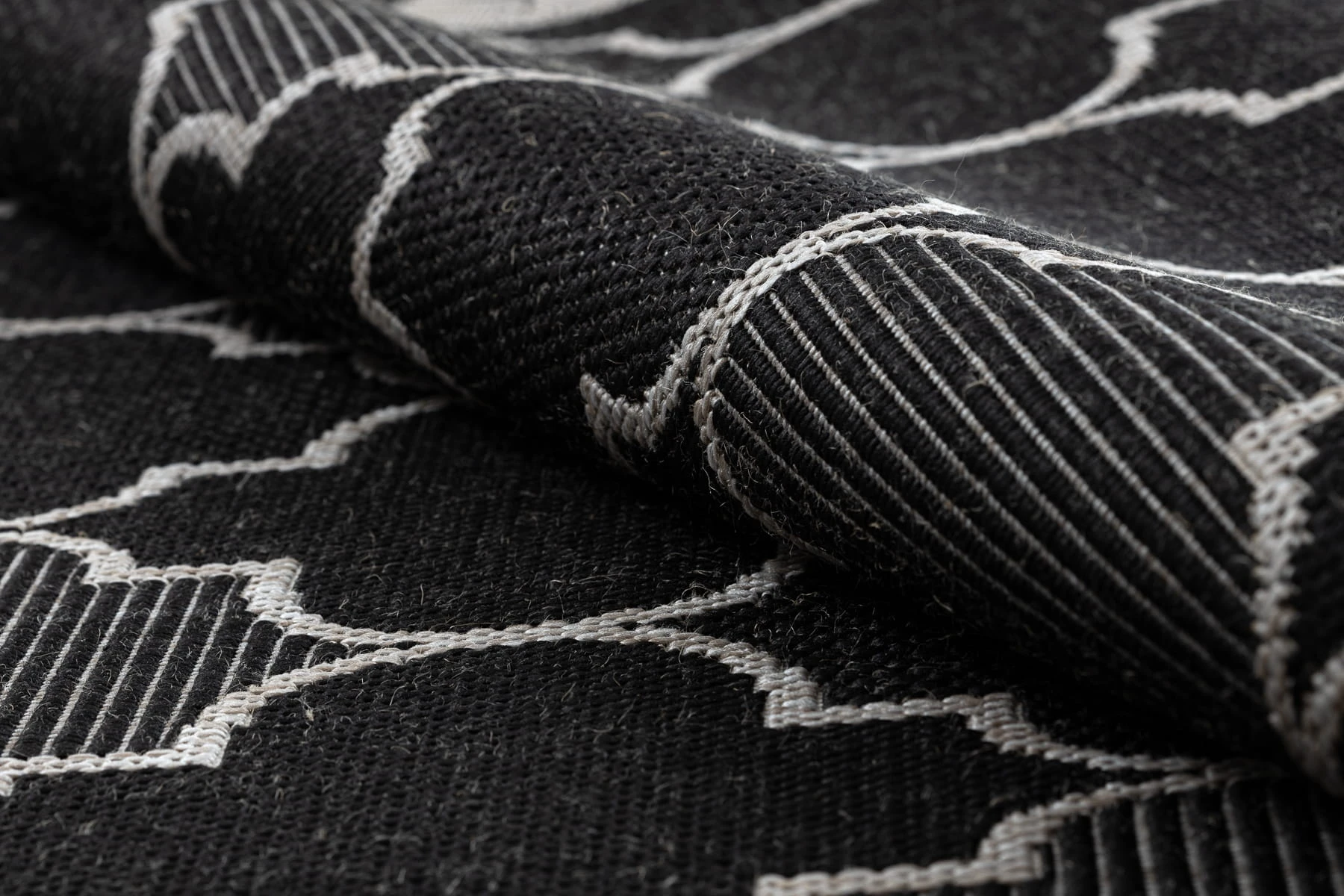 Czarno-srebrny dywan z geometrycznym wzorem marokańskiej koniczyny, który doda korytarzowi elegancki charakter.