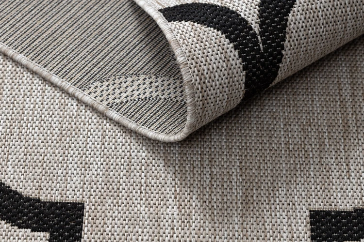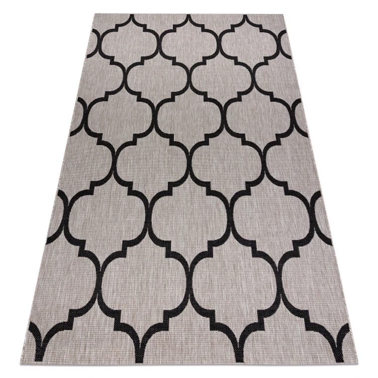 Sznurkowy dywan z motywem marokańskiej koniczyny w odcieniach srebra i czerni, odporny na warunki atmosferyczne, idealny na taras i balkon.