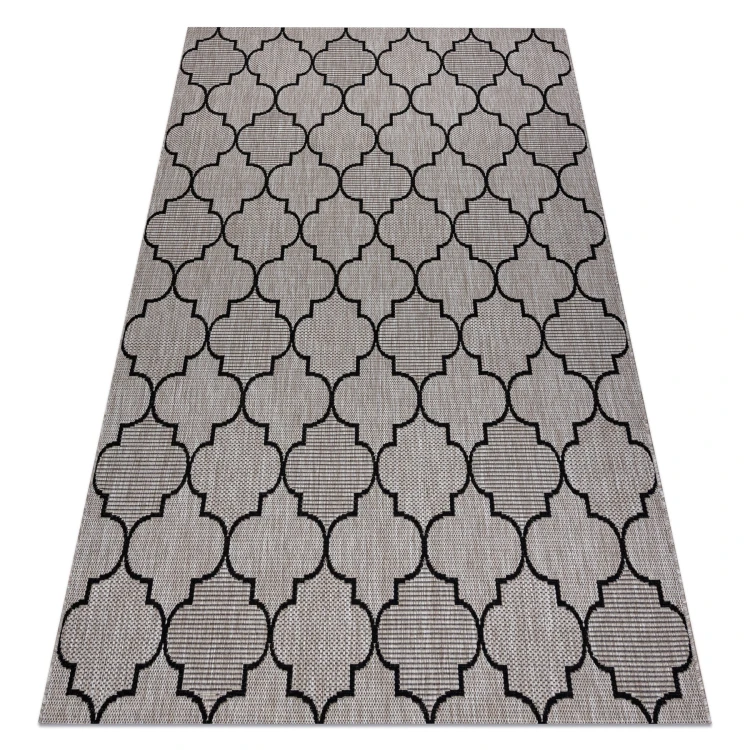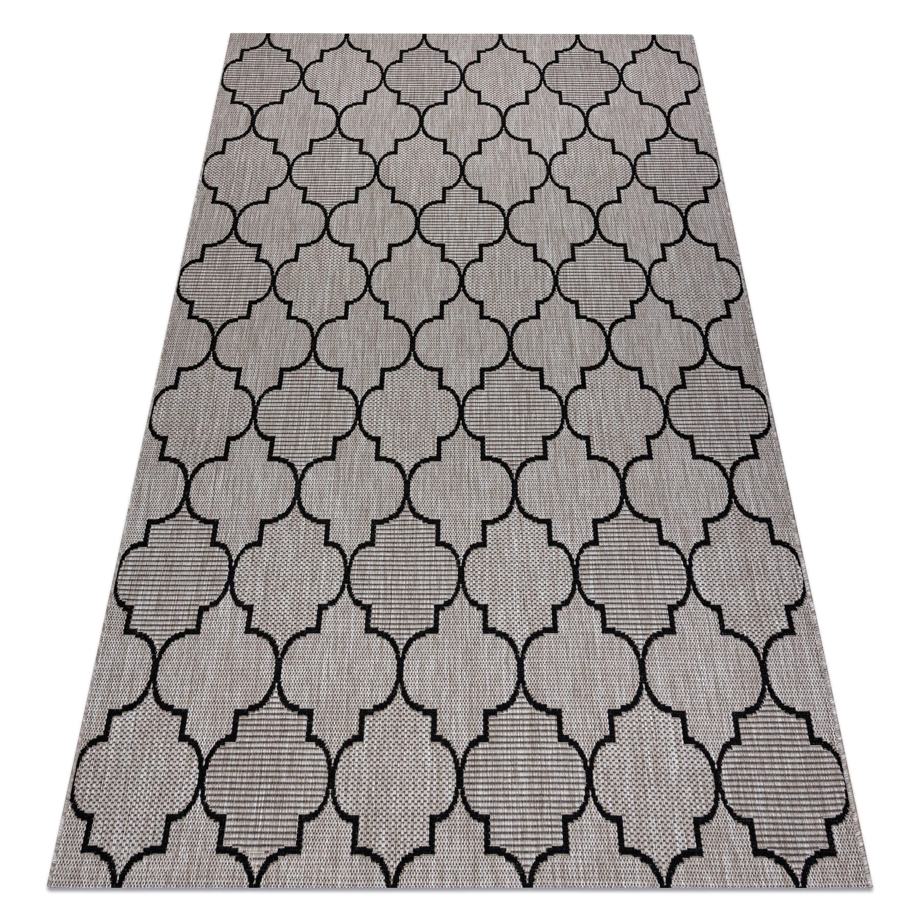 Sznurkowy dywan w odcieniach srebra i czerni z marokańską koniczyną, odporny na warunki atmosferyczne, idealny na taras i balkon.