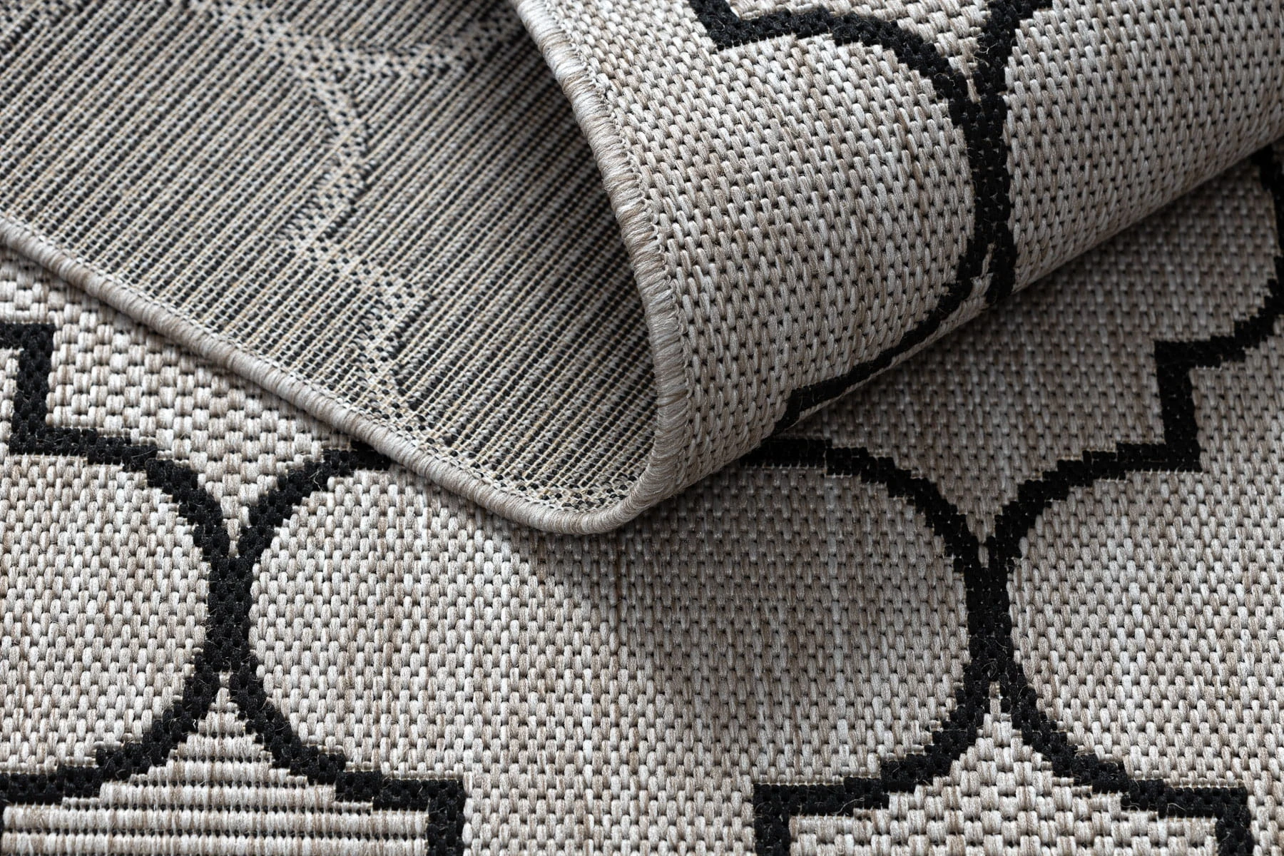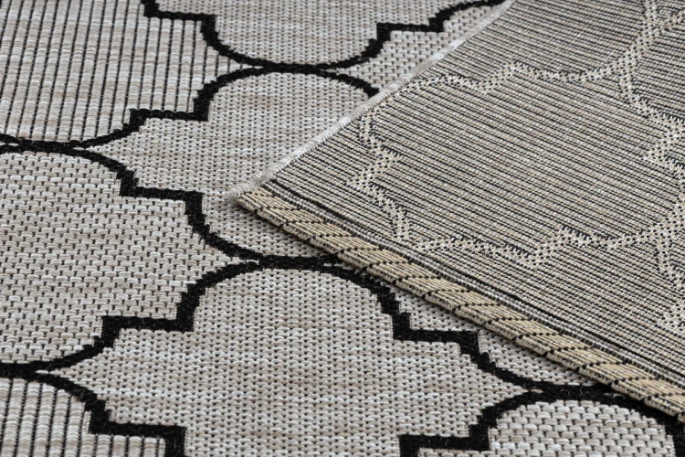 Sznurkowy dywan w odcieniach srebra i czerni z marokańską koniczyną, odporny na warunki atmosferyczne, idealny na taras i balkon.