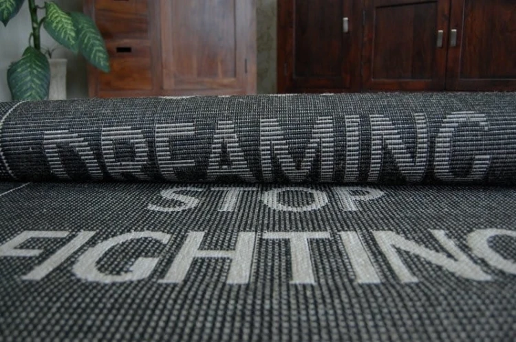 Sznurkowy dywan w odcieniach czerni i srebra, odporny na warunki atmosferyczne, idealny na taras i balkon.