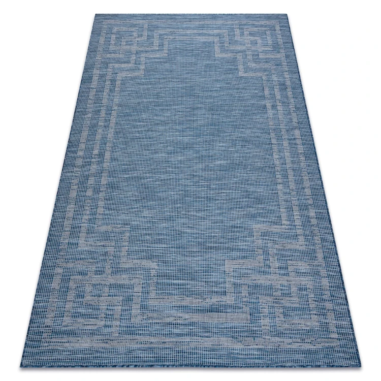 Sznurkowy dywan w odcieniach granatu i beżu, odporny na warunki atmosferyczne, idealny na taras i balkon.
