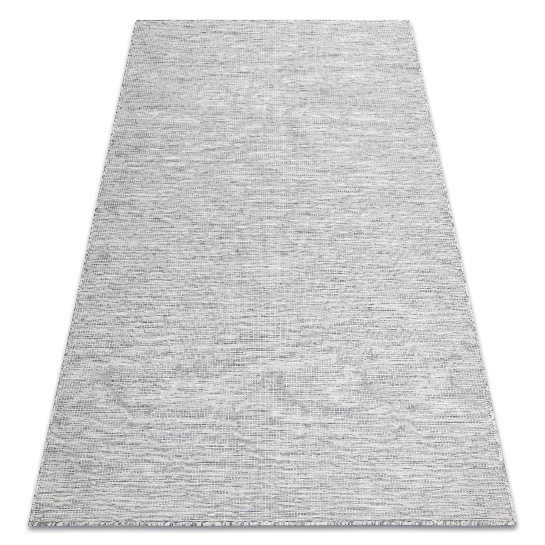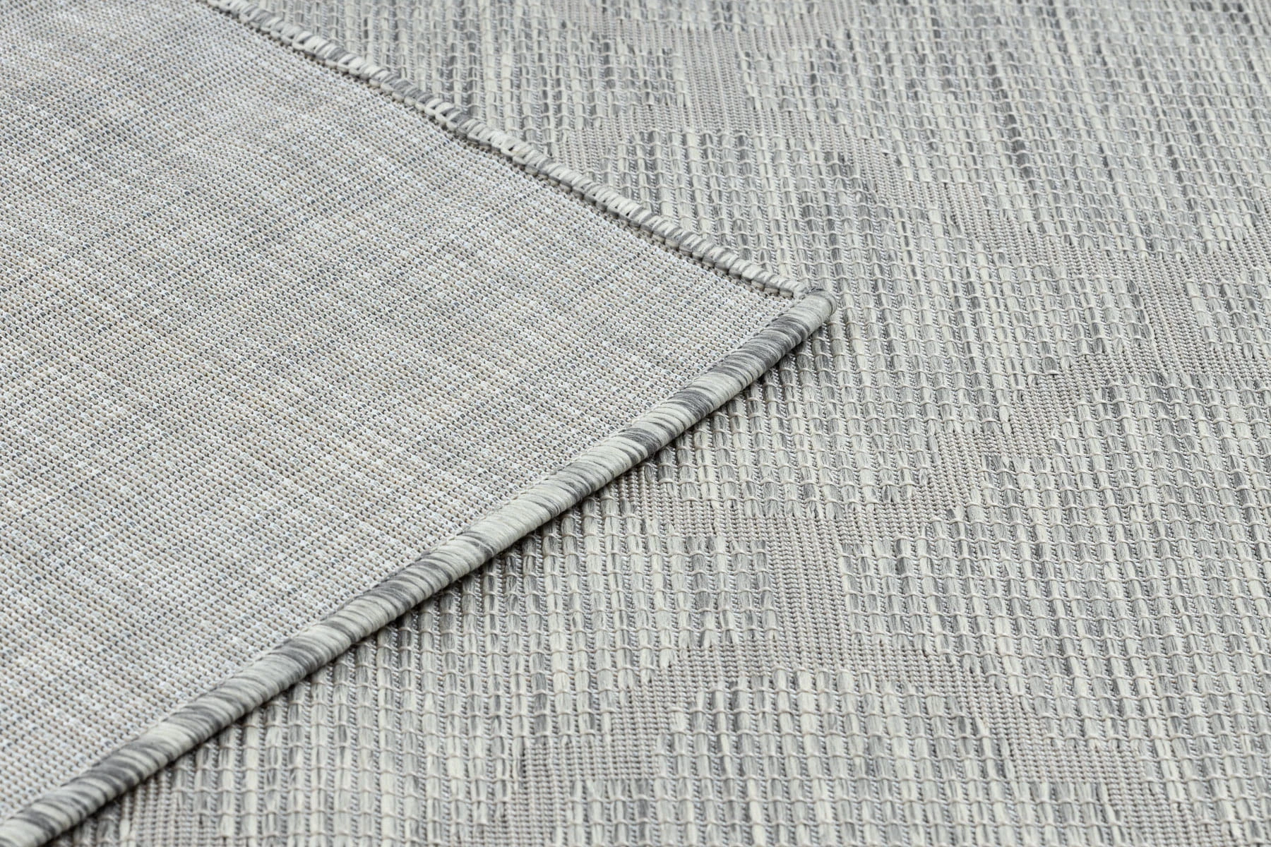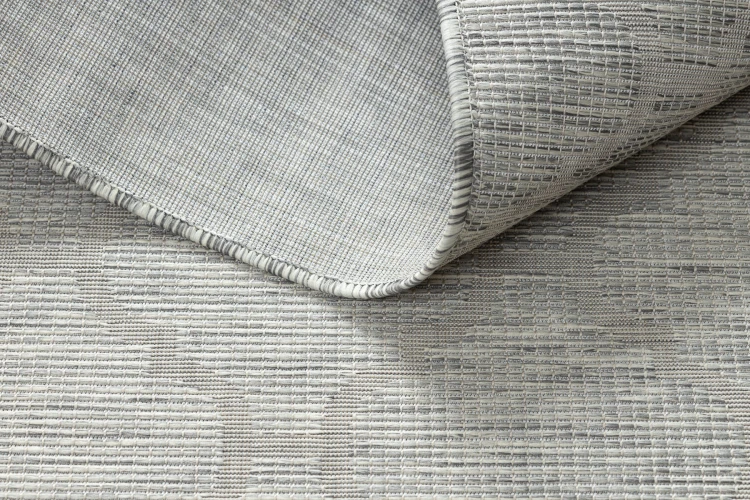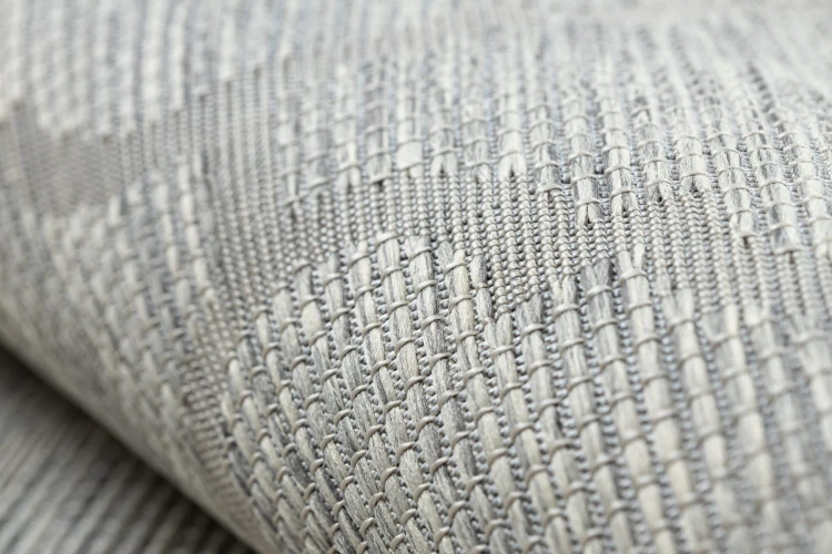 Sznurkowy dywan w odcieniach szarości i beżu, odporny na warunki atmosferyczne, idealny na taras i balkon.