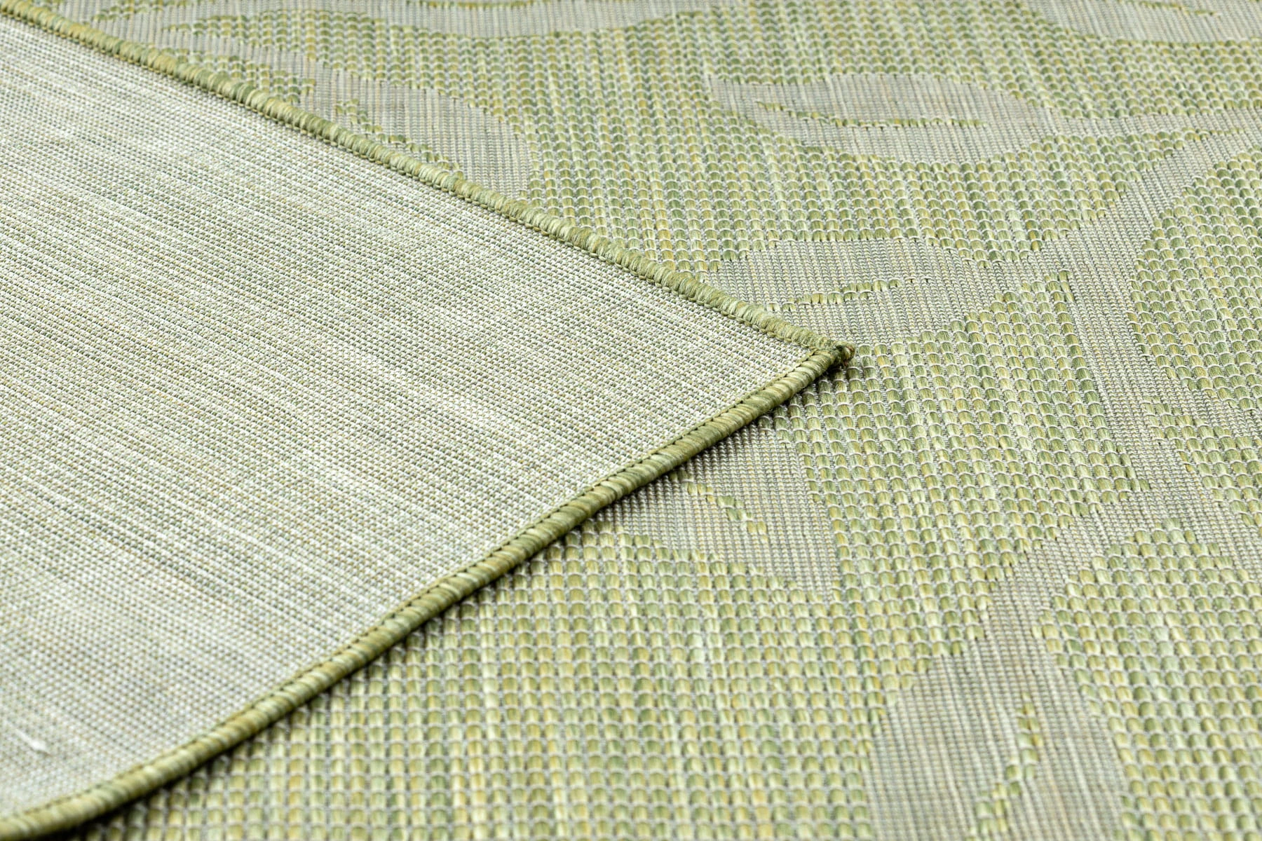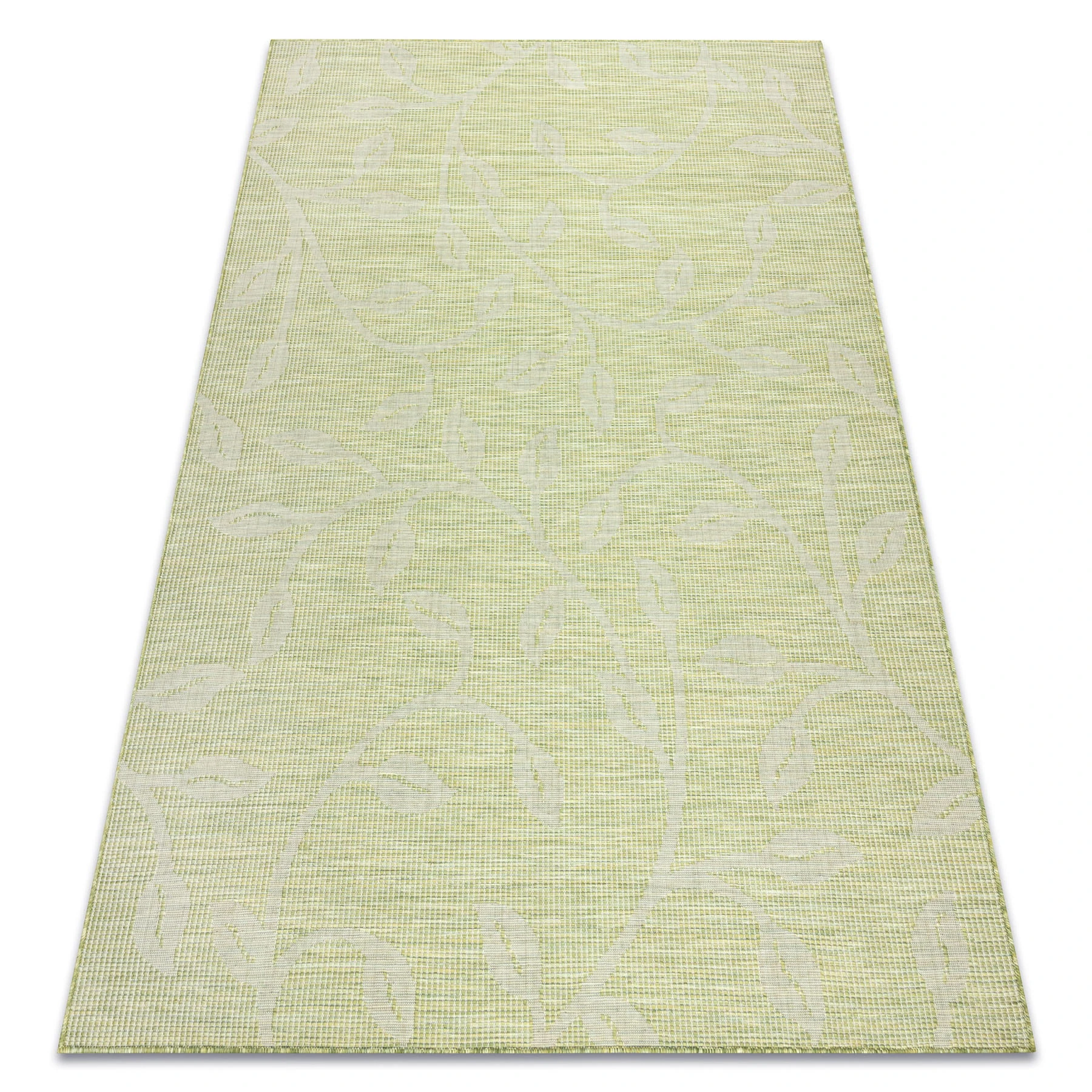 Zielono-beżowy dywan płaskotkany z motywem liści, który wprowadzi do korytarza świeżość natury i naturalny akcent kolorystyczny.