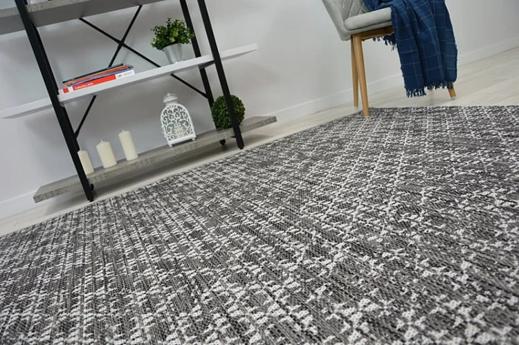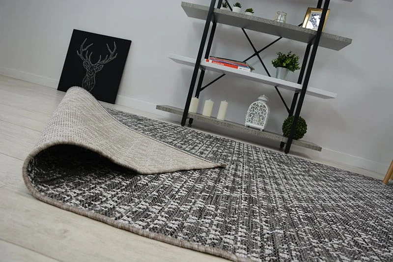 Sznurkowy dywan w odcieniach srebra i szarości, odporny na warunki atmosferyczne, idealny na taras i balkon.