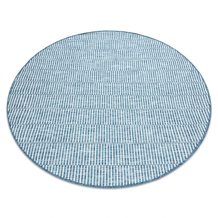 Okrągły sznurkowy dywan w odcieniach niebieskiego i srebra, odporny na warunki atmosferyczne, idealny na taras i balkon.