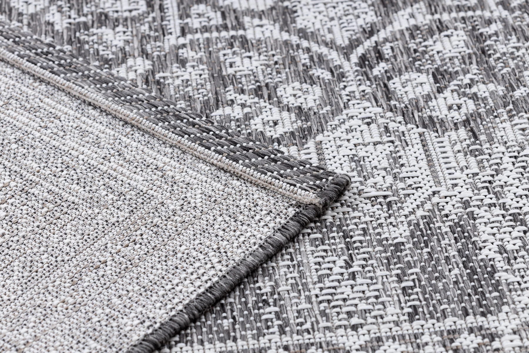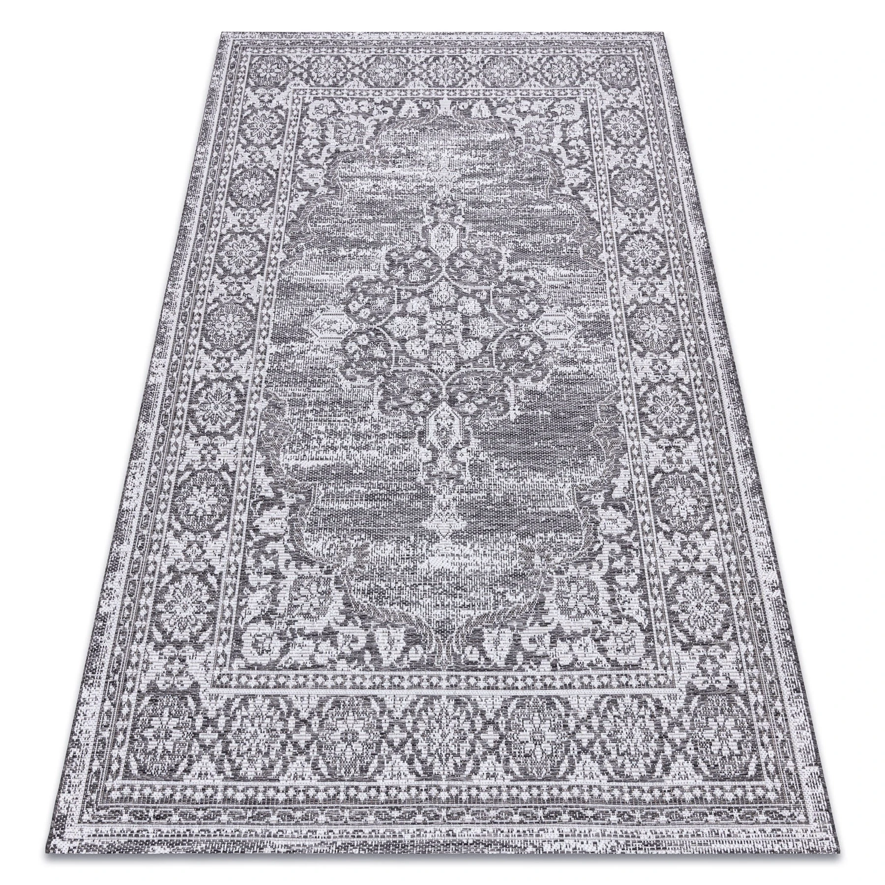 Srebrny dywan z abstrakcyjnym wzorem ornamentowym, który nada korytarzowi elegancki i nowoczesny charakter.