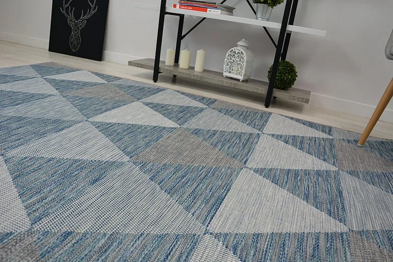 Sznurkowy dywan z geometrycznymi trójkątami w odcieniach kości słoniowej, srebra i niebieskiego, odporny na warunki atmosferyczne, idealny na taras i balkon.