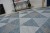 Sznurkowy dywan z geometrycznymi trójkątami w odcieniach kości słoniowej, srebra i niebieskiego, odporny na warunki atmosferyczne, idealny na taras i balkon.
