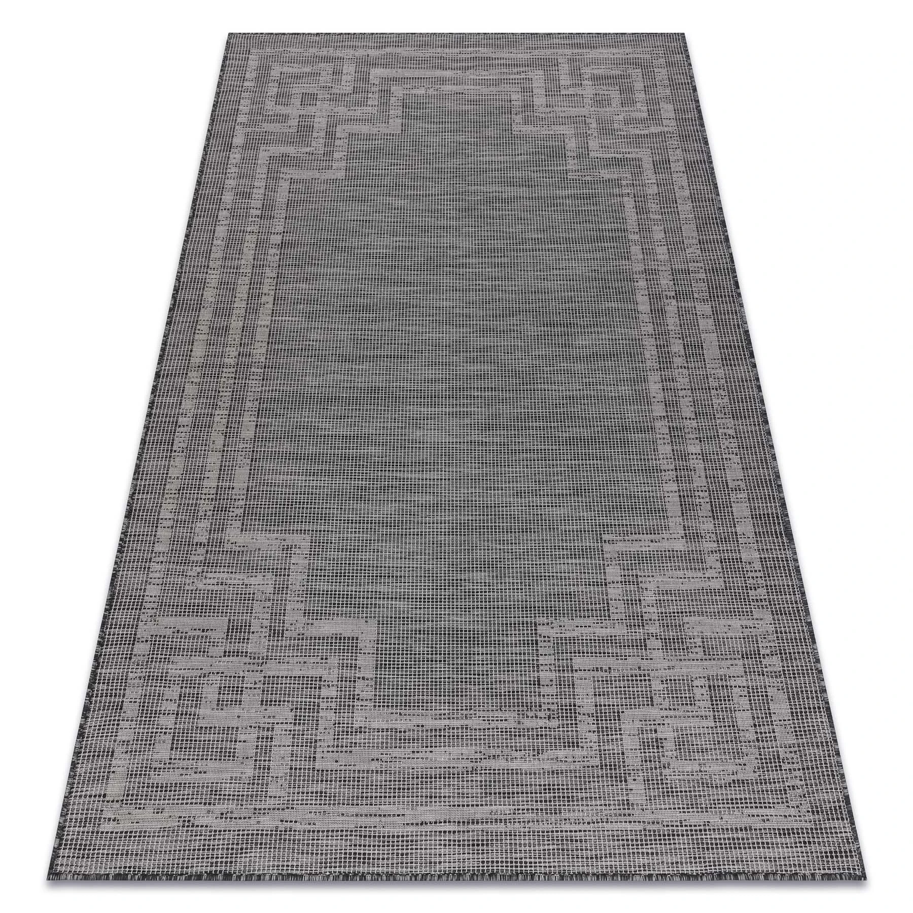 Sznurkowy dywan w odcieniach szarości z ramką, odporny na warunki atmosferyczne, idealny na taras i balkon.
