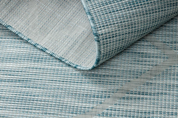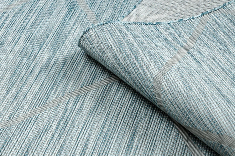 Sznurkowy dywan w odcieniach niebieskiego, odporny na warunki atmosferyczne, idealny na taras i balkon.