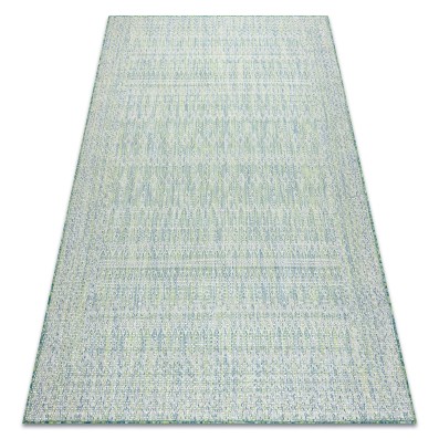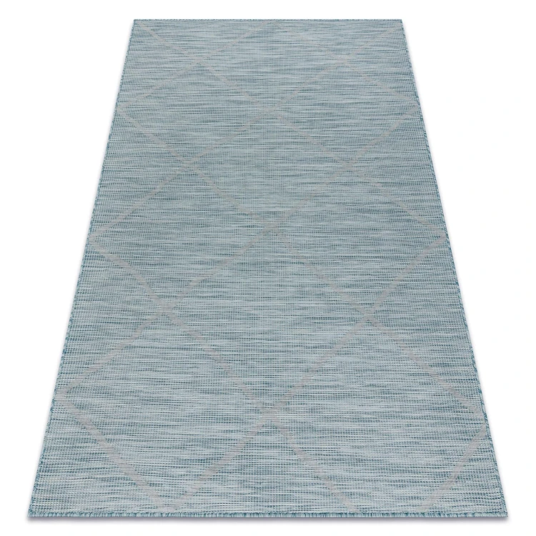 Niebieski dywan płaskotkany z abstrakcyjnym wzorem, który ożywi korytarz świeżym kolorem i nadaje mu nowoczesny charakter.