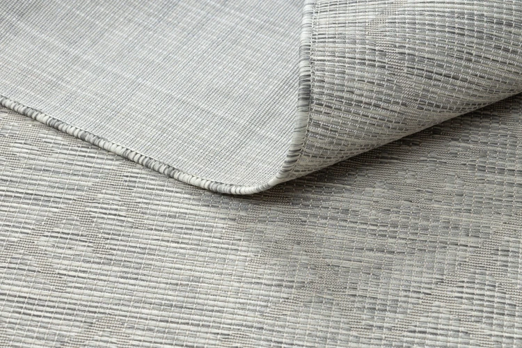 Sznurkowy dywan w odcieniach szarości i beżu, odporny na warunki atmosferyczne, idealny na taras i balkon.