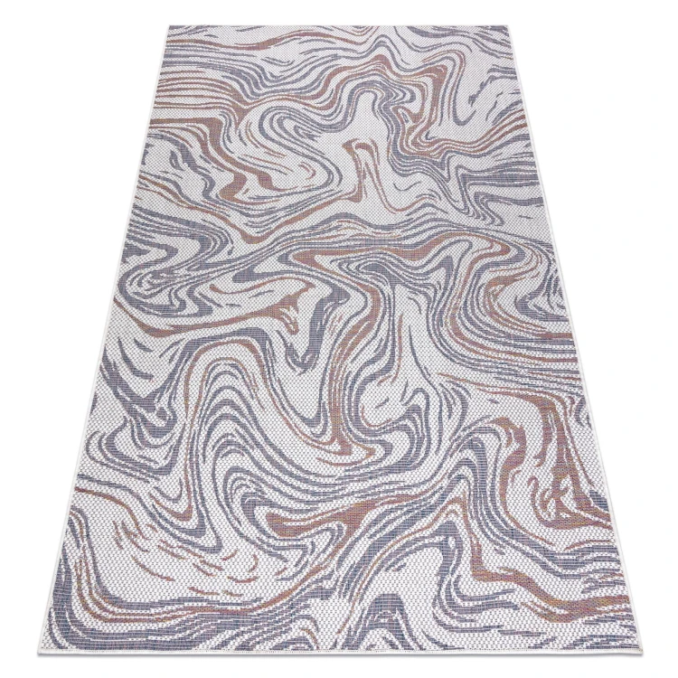 Beżowo-niebieski dywan sznurkowy z abstrakcyjnym wzorem fal, który wprowadzi do salonu spokojną, nadmorską atmosferę.