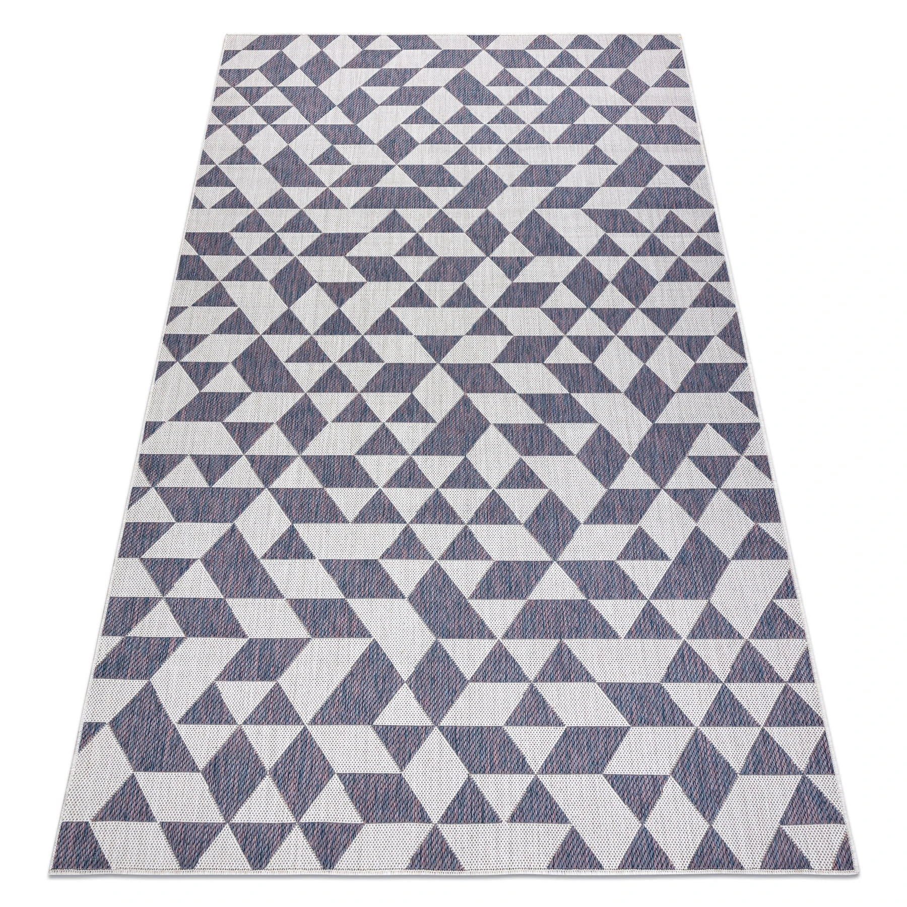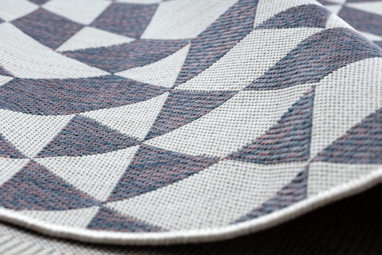 Beżowo-niebieski dywan z geometrycznym wzorem, który doskonale sprawdzi się w salonie, dodając wnętrzu nowoczesny charakter.