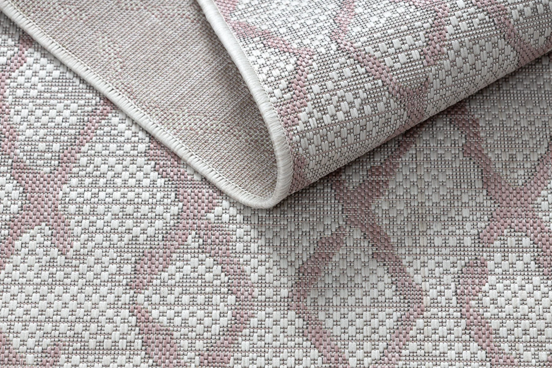 Szaro-różowy dywan sznurkowy z wzorem kratki, który wniesie delikatny akcent do salonu lub pokoju.