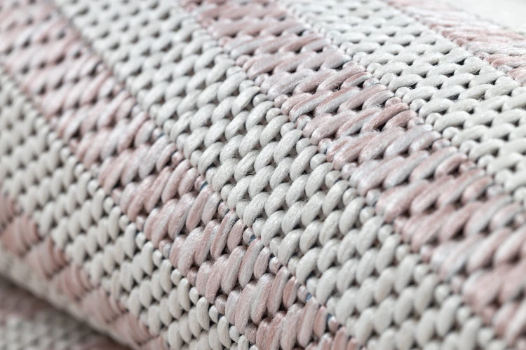 Różowo-kremowy dywan z geometrycznym wzorem labiryntu, który nadaje wnętrzu delikatny, ale wyrazisty charakter.