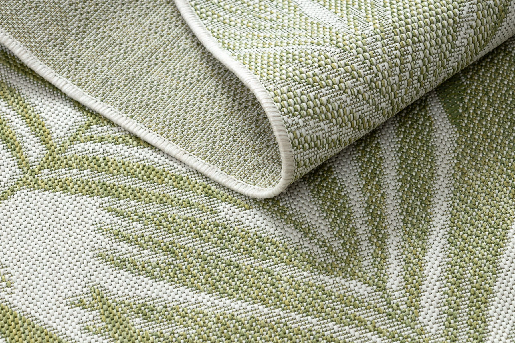 Kremowy dywan z roślinnym wzorem liści palmy, który wprowadzi do korytarza naturalny, tropikalny klimat.