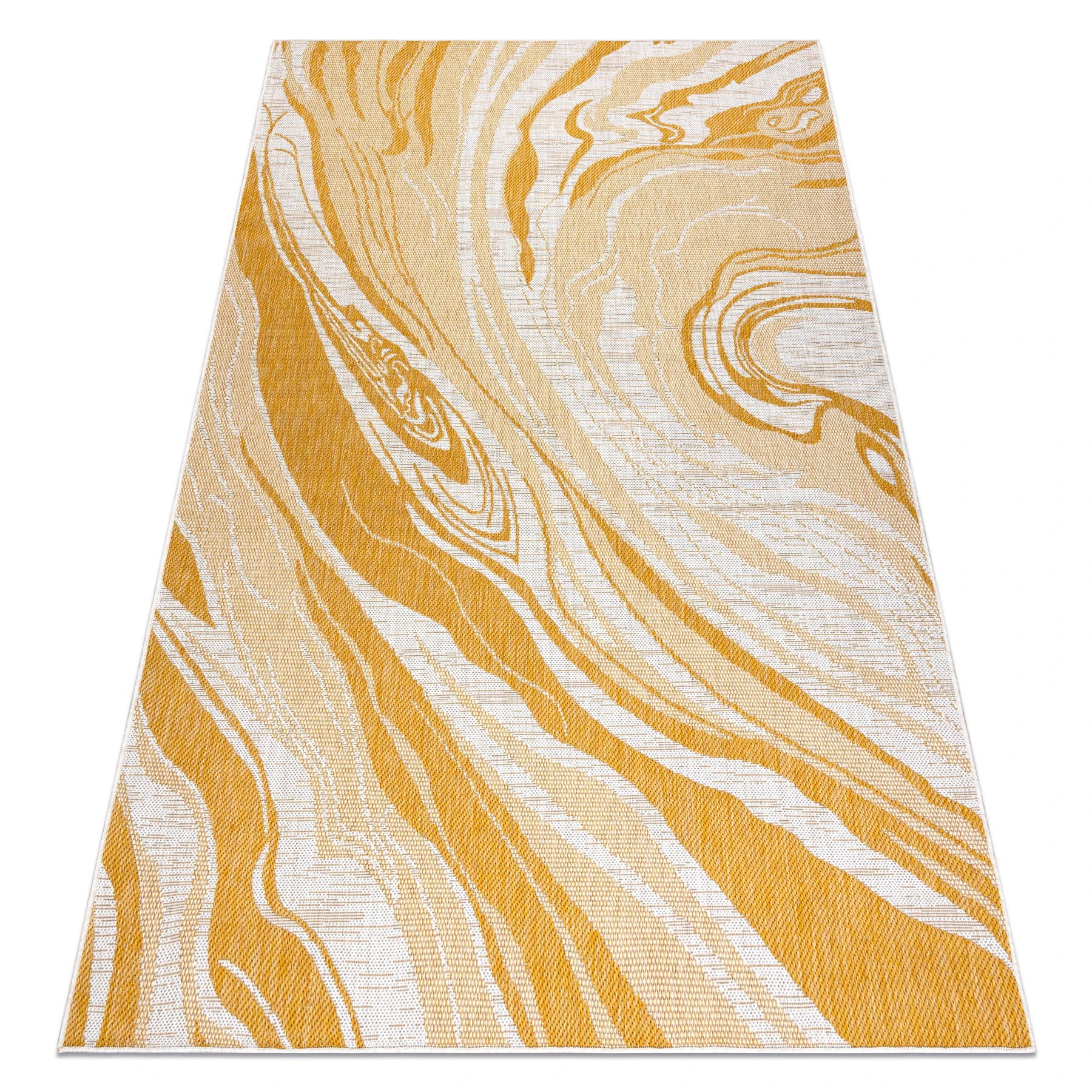 Żółto-beżowy dywan z abstrakcyjnym wzorem marmuru, który ożywi salon ciepłym, słonecznym akcentem.
