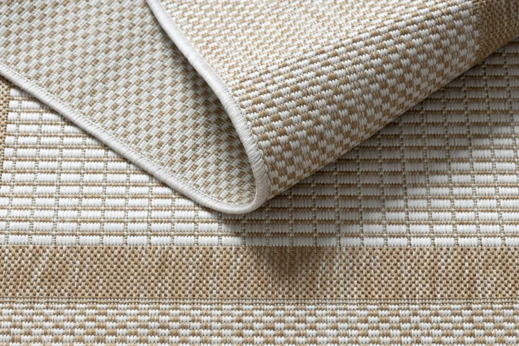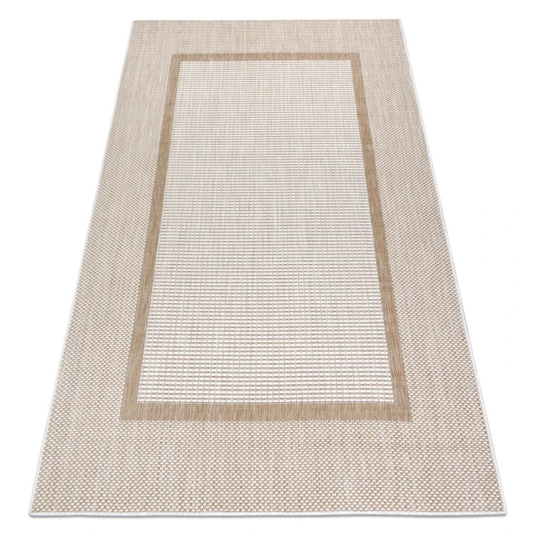 Sznurkowy dywan w odcieniu beżu z ramką, odporny na warunki atmosferyczne, idealny na taras i balkon.