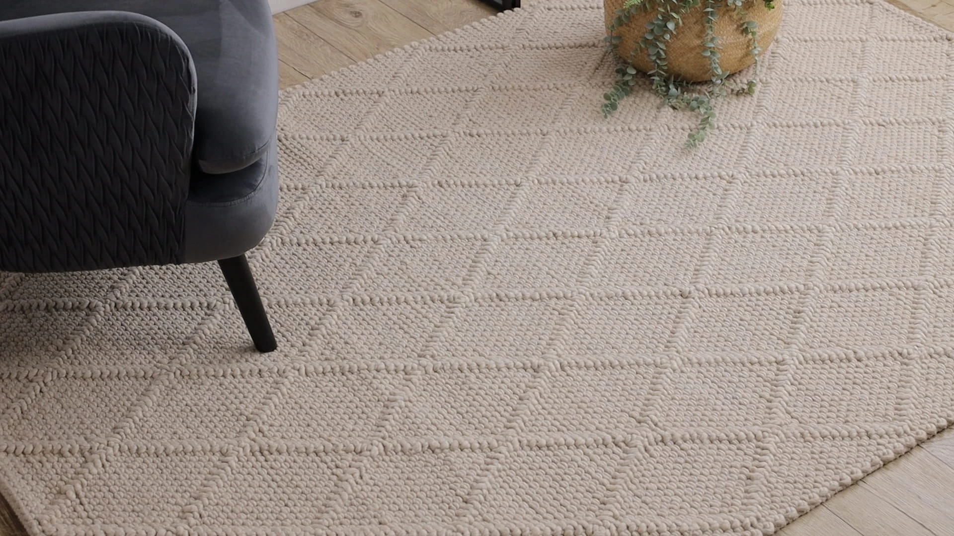 Kremowy dywan z geometrycznym wzorem rombów, który doskonale sprawdzi się w salonie, nadając mu nowoczesny charakter.