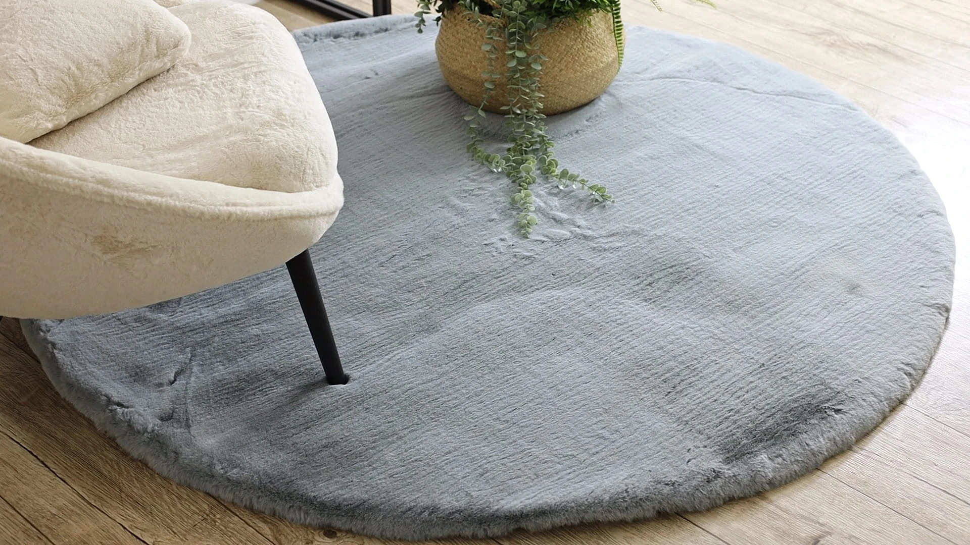 Okrągły srebrny dywan shaggy, który doda salonowi lub pokojowi subtelny elegancki akcent.