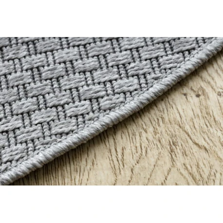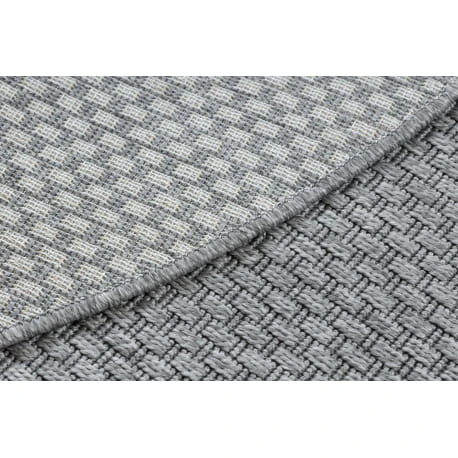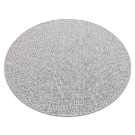Okrągły sznurkowy dywan w odcieniach szarości, odporny na warunki atmosferyczne, idealny na taras i balkon.
