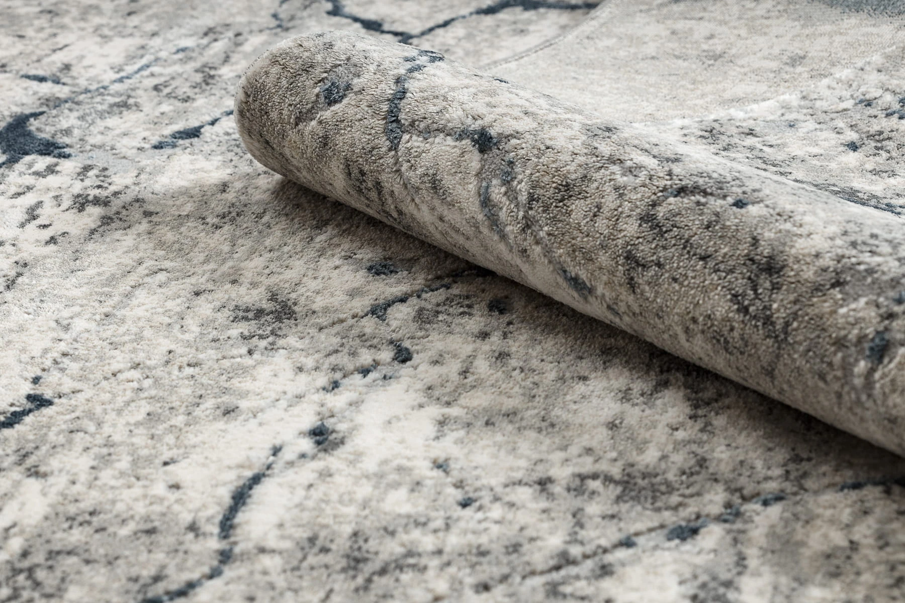 Szary dywan z abstrakcyjnym wzorem, który doskonale sprawdzi się w salonie lub pokoju, nadając wnętrzu nowoczesny charakter.