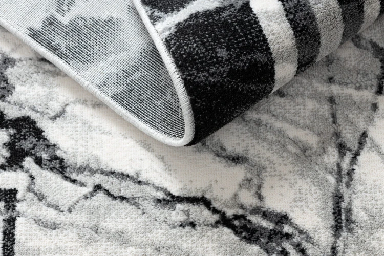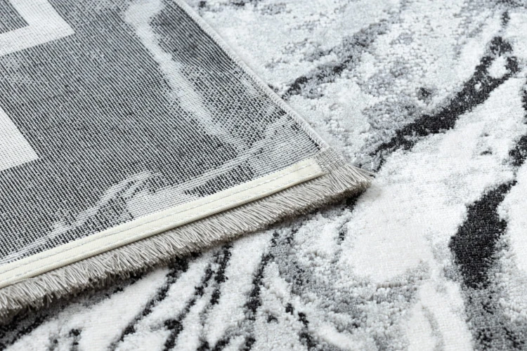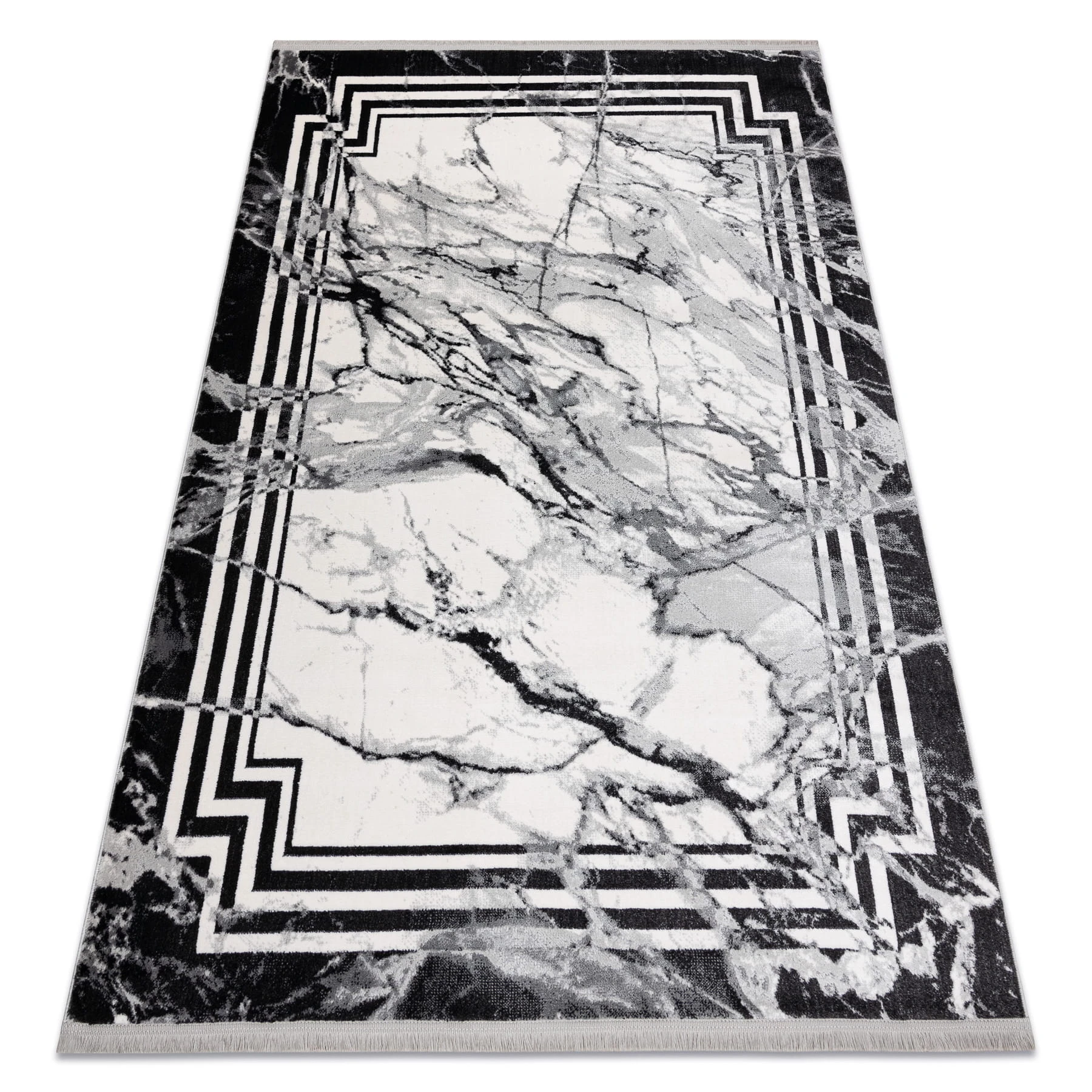 Szary dywan z marmurkowym wzorem i elegancką ramką, który doda salonowi wykwintnego charakteru.