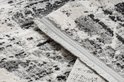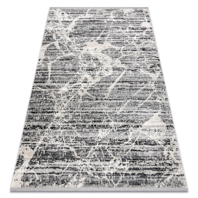 Szaro-kremowy dywan z abstrakcyjnym wzorem, który doskonale wpisze się w nowoczesny salon lub pokój.
