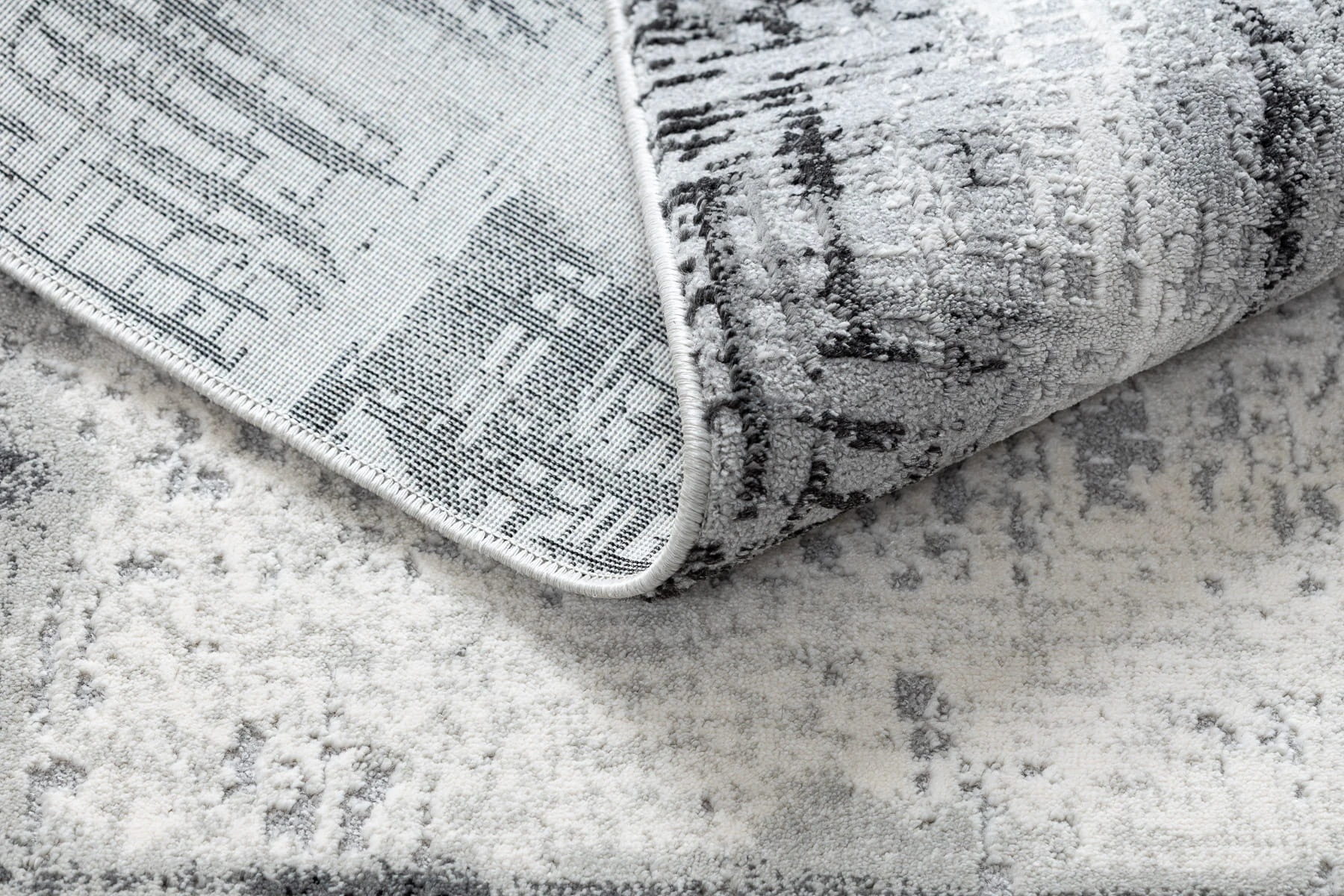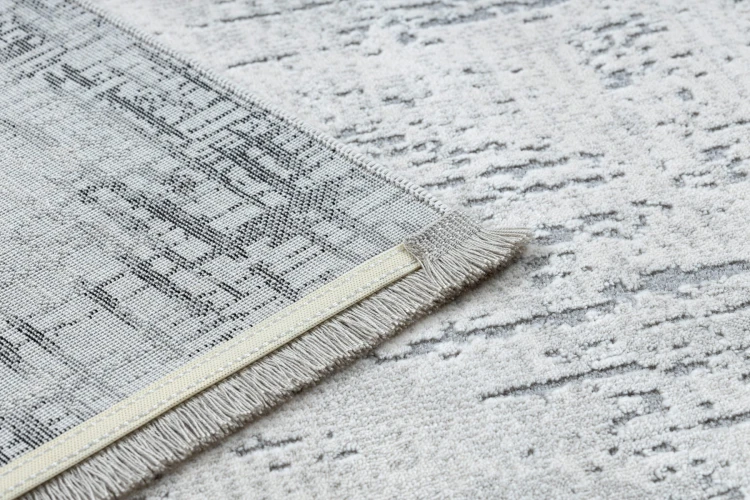 Szary dywan z subtelną ramką, który doskonale sprawdzi się w salonie lub pokoju, dodając wnętrzu elegancki charakter.