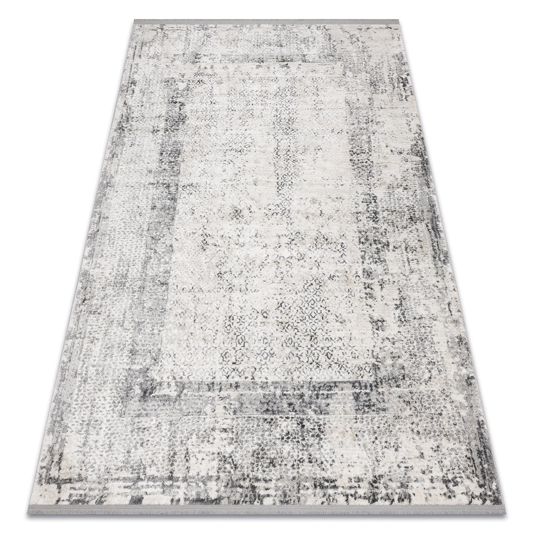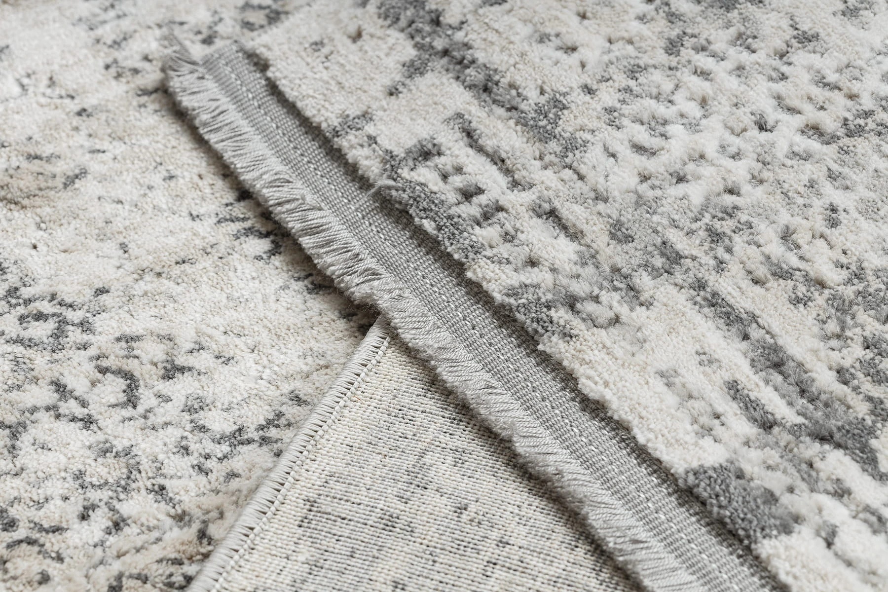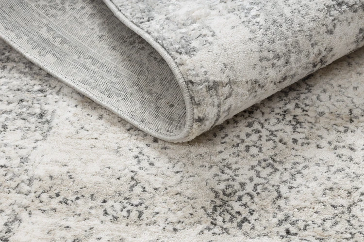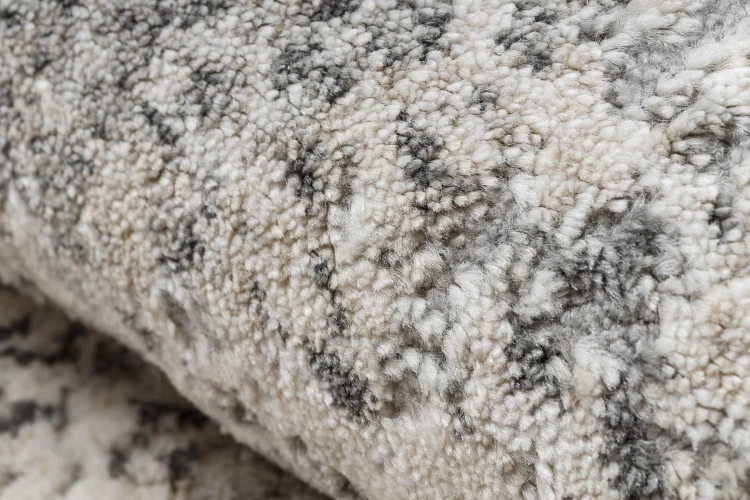 Szaro-kremowy dywan z abstrakcyjnym wzorem, który doskonale wpisze się w nowoczesny salon lub pokój.