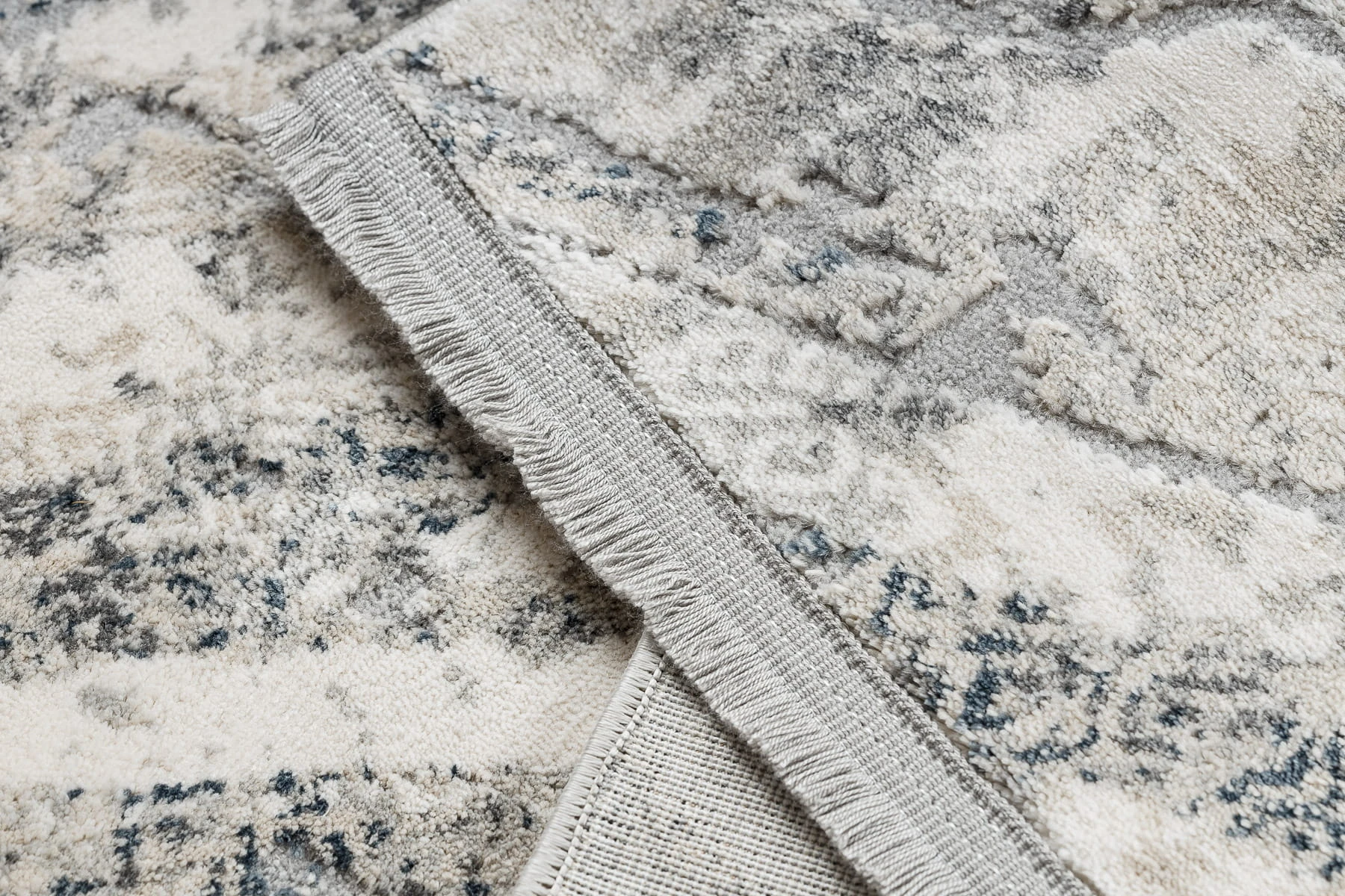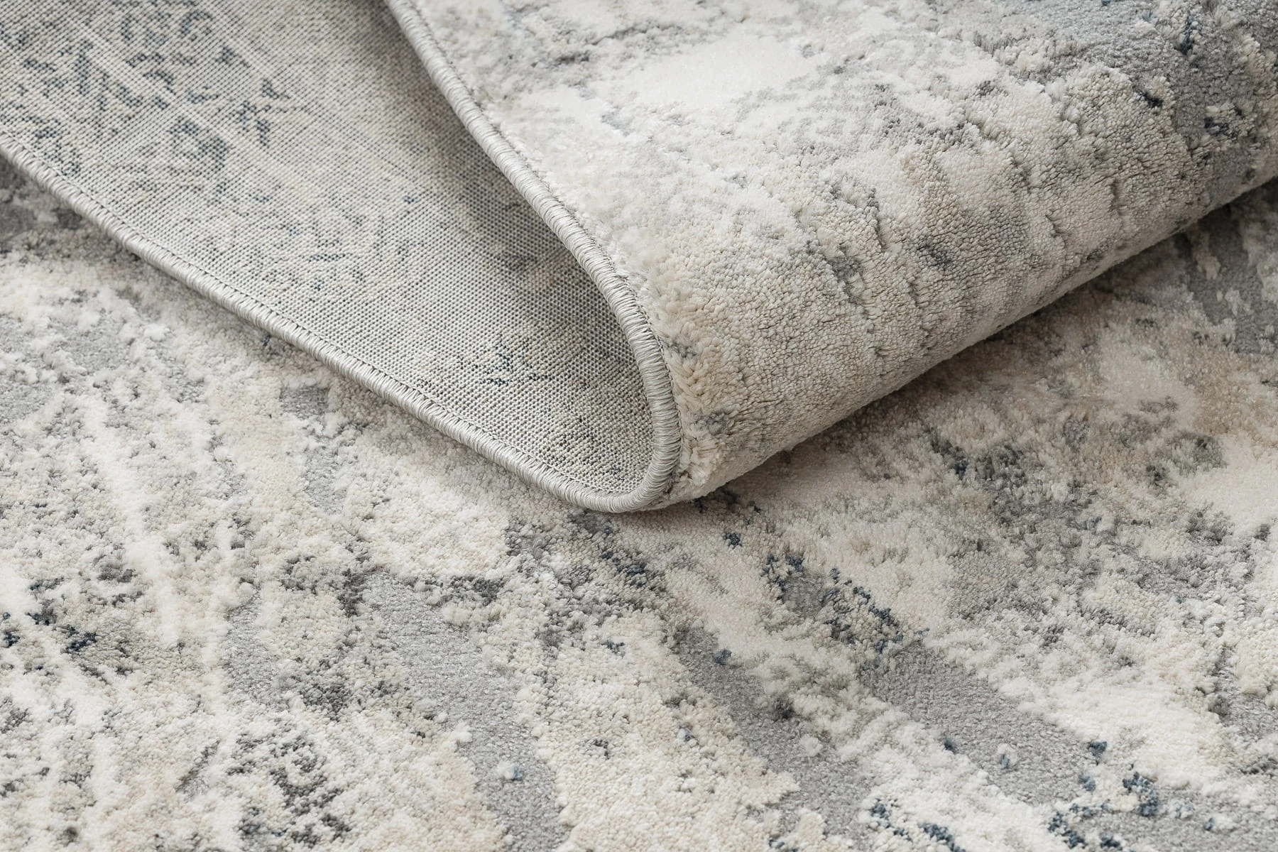 Szaro-kremowy dywan z abstrakcyjnym wzorem, który doskonale wpisze się w nowoczesny salon lub pokój.