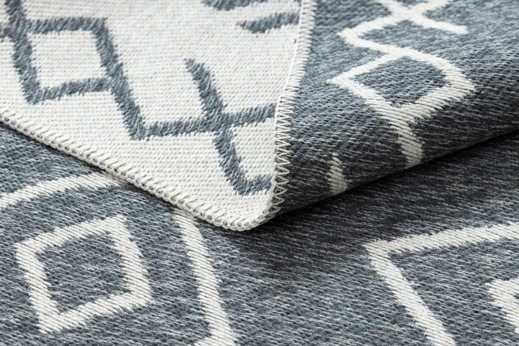 Szaro-kremowy dywan z geometrycznym wzorem, który idealnie wypełni długi korytarz, nadając mu nowoczesny charakter.
