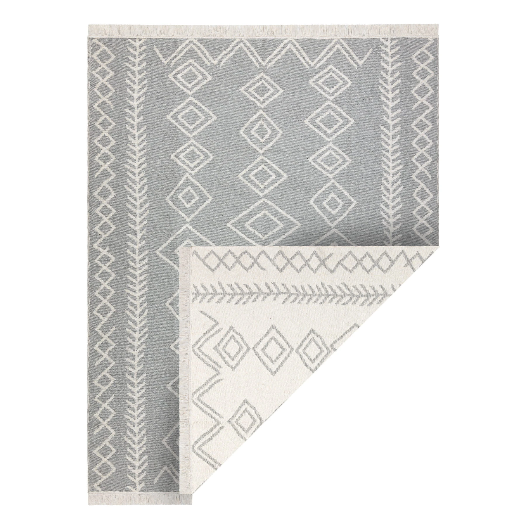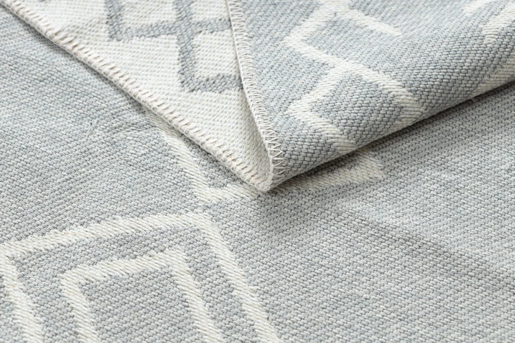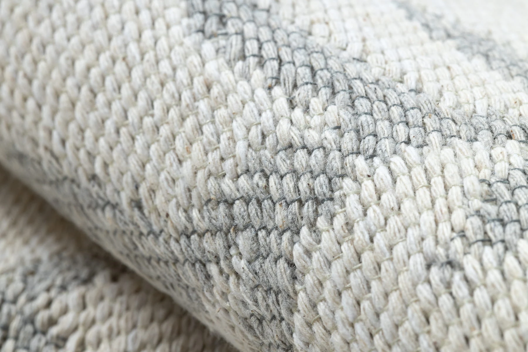 Szaro-kremowy dywan z geometrycznym wzorem, który nada salonowi lub pokojowi nowoczesny charakter w stylu boho.