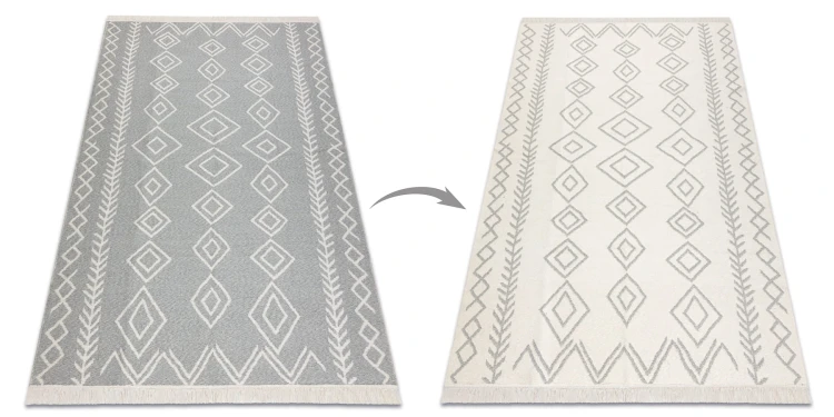 Szaro-kremowy dywan z geometrycznym wzorem, który nada salonowi lub pokojowi nowoczesny charakter w stylu boho.