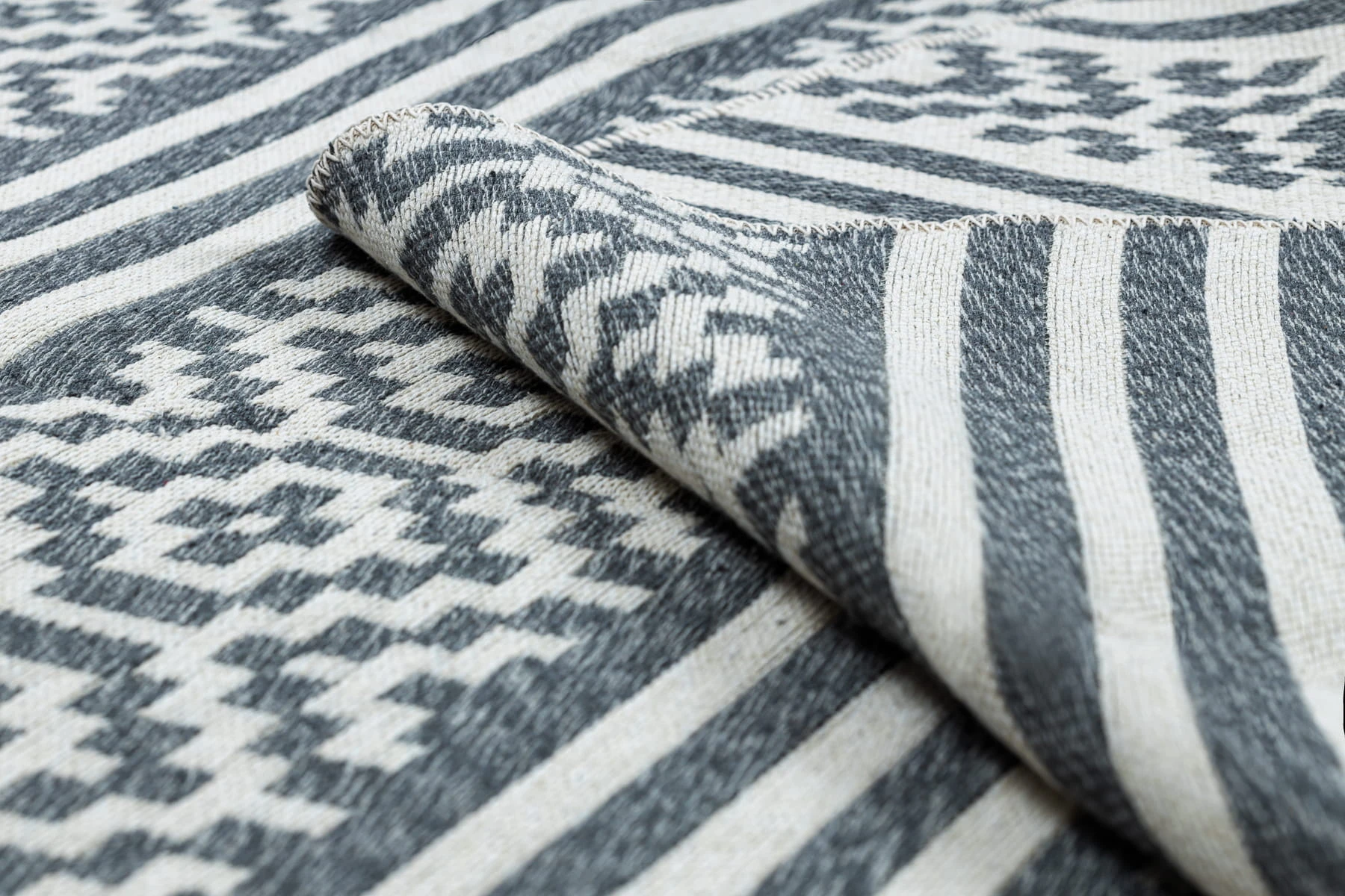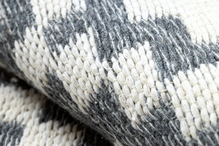 Szary dywan z geometrycznym wzorem w kremowych akcentach, który wprowadzi nowoczesny porządek do salonu lub pokoju.