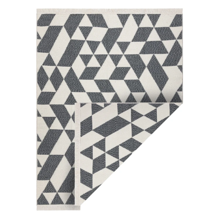 Szary dywan z geometrycznym wzorem w kremowych akcentach, idealny do długich korytarzy, gdzie wprowadzi nowoczesny charakter.