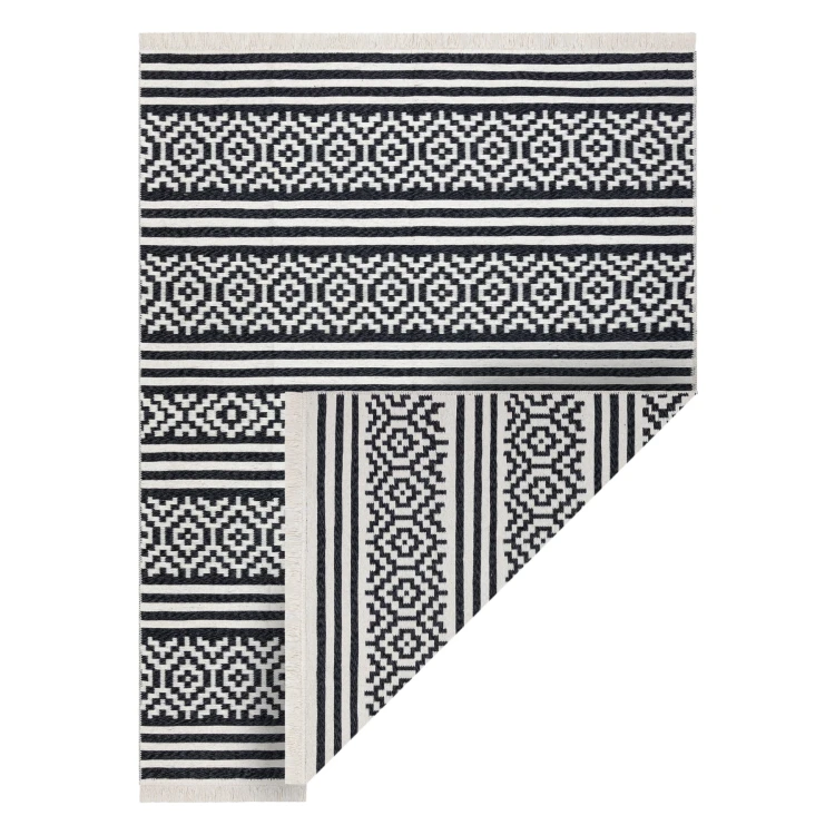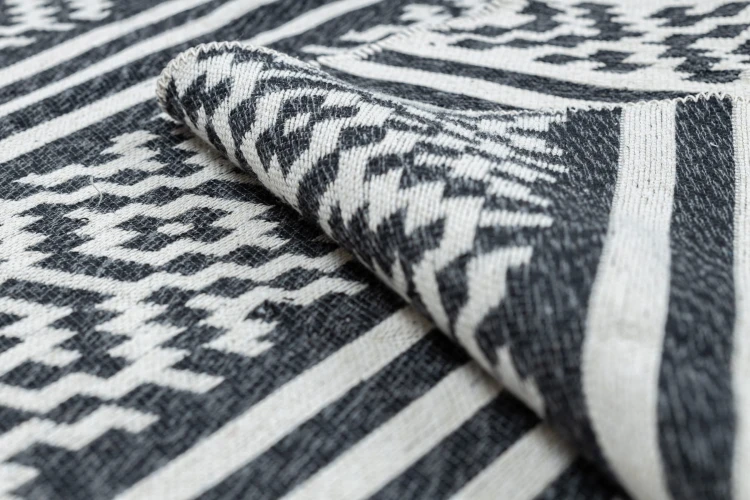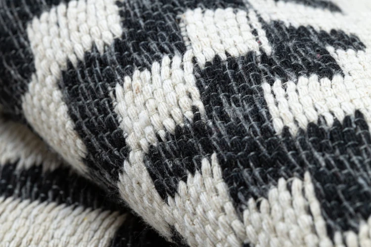 Kremowo-czarny dywan z geometrycznym wzorem, który doskonale wpisze się w nowoczesny salon lub pokój.