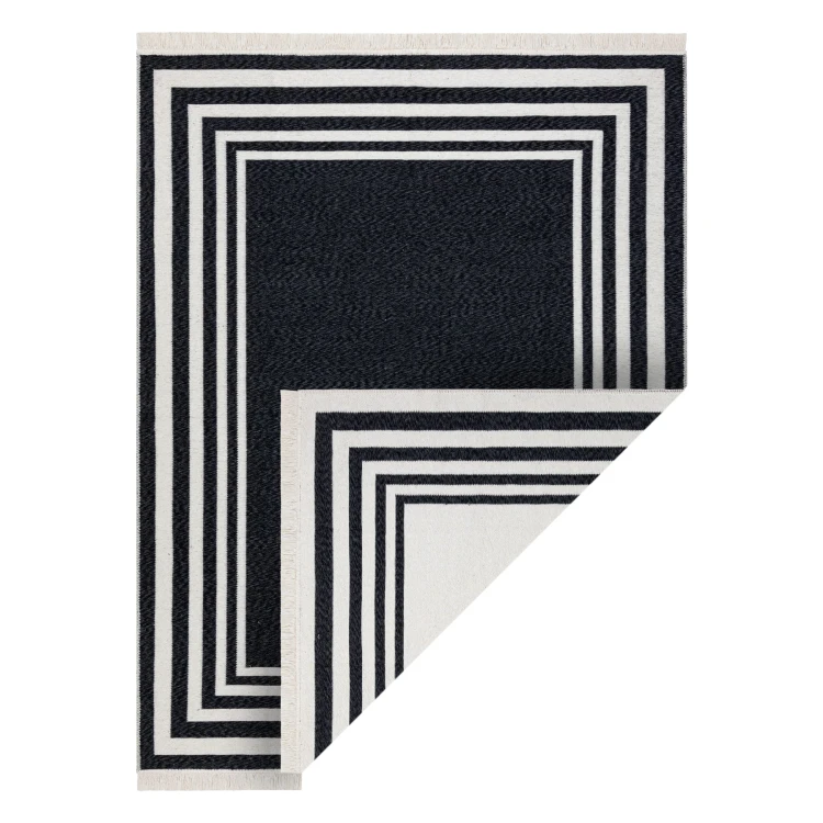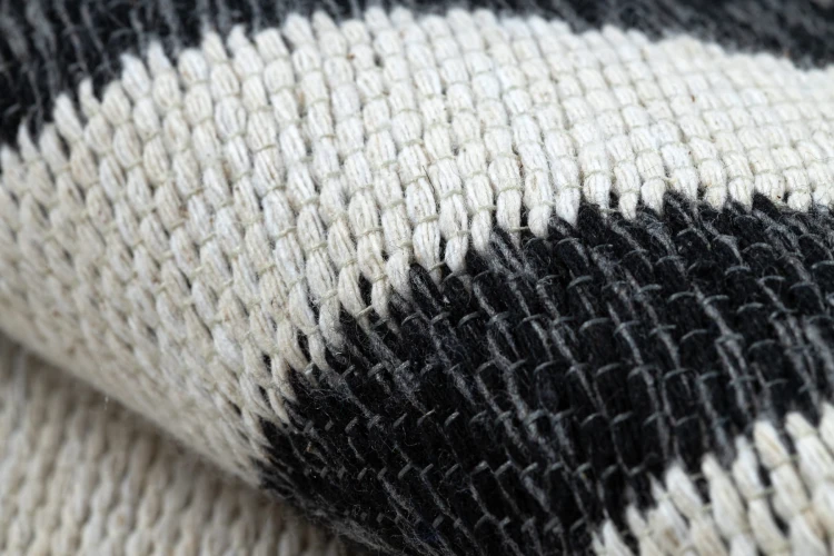 Minimalistyczny dywan bawełniany z czarną ramką na kremowym tle, który doskonale podkreśli nowoczesny charakter salonu.