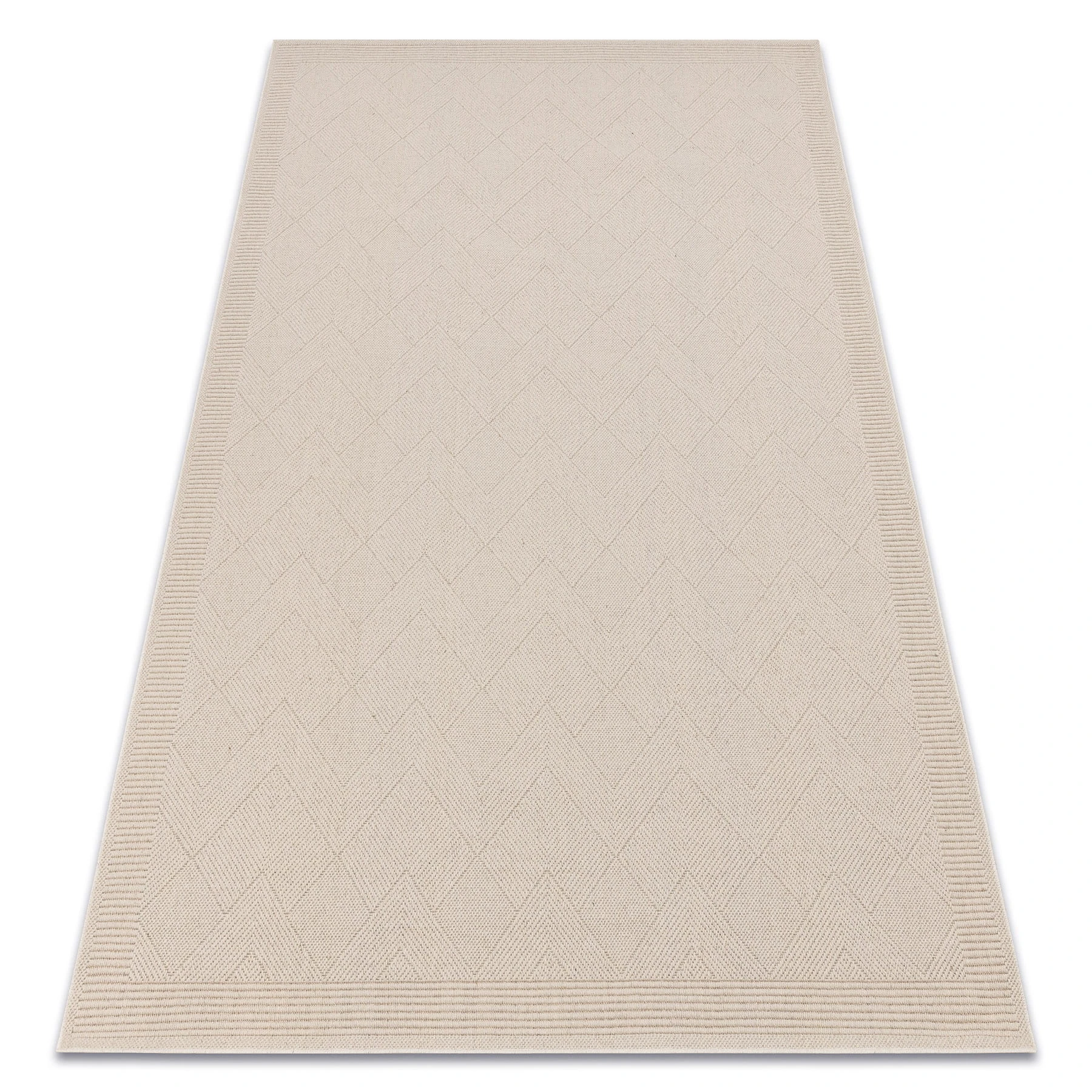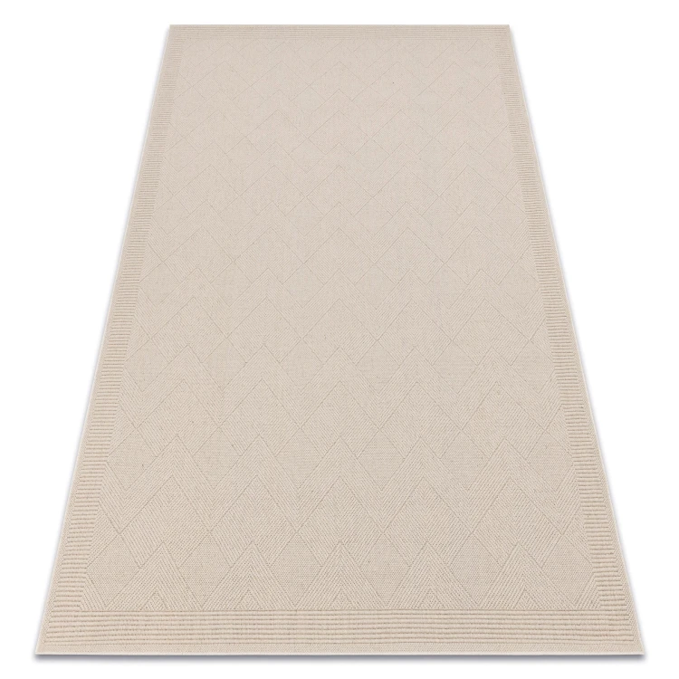 Beżowy dywan z wełny z abstrakcyjnym wzorem zygzaka, który wprowadzi do salonu lub pokoju nowoczesny akcent w ciepłych odcieniach.